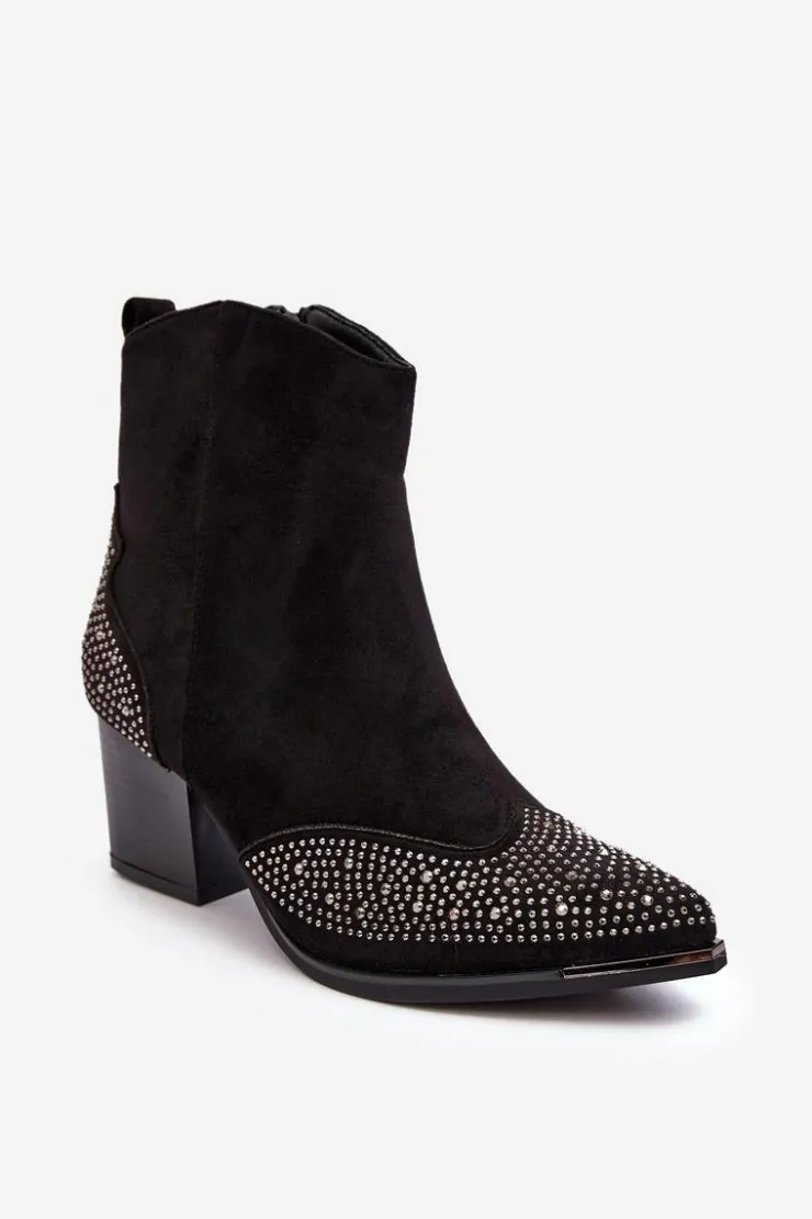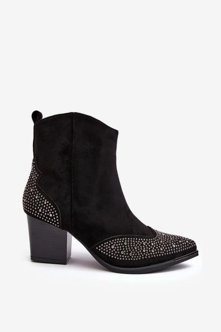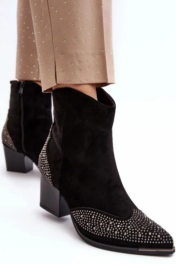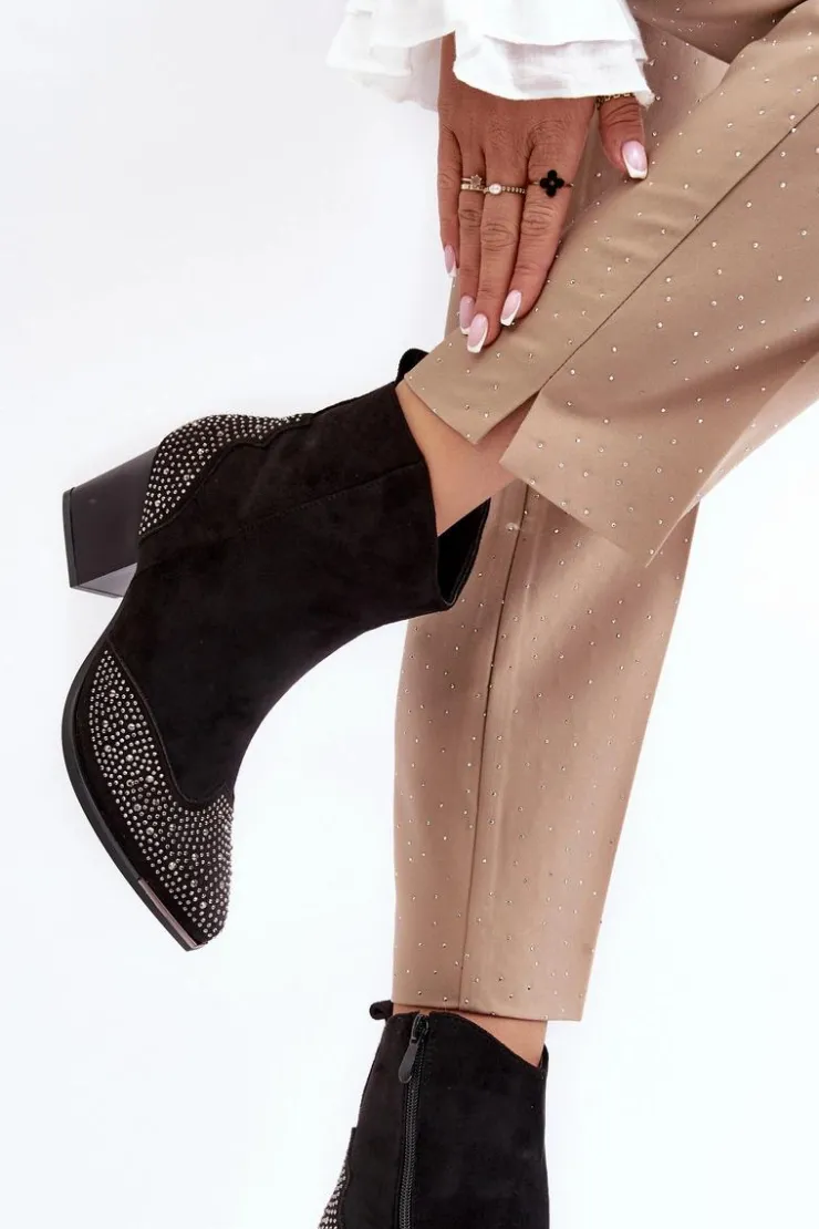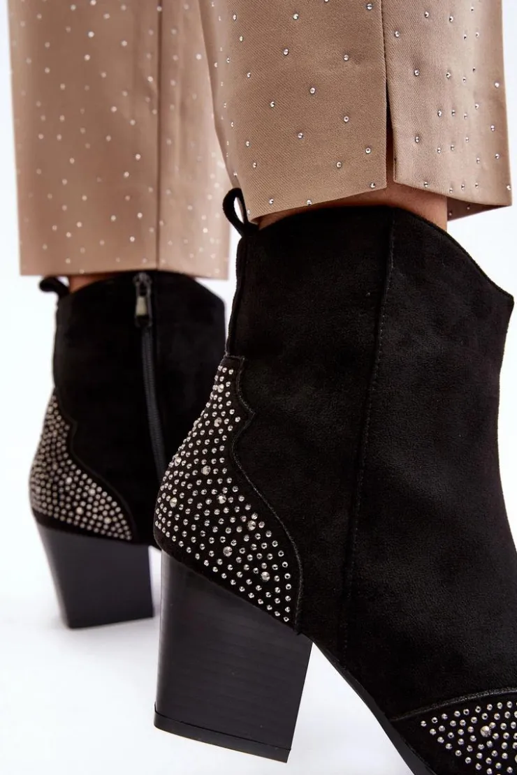 Botki w stylu kowbojek wykonane z eko zamszu. Osadzone na obcasie w postaci słupka. Noski w szpic optycznie wysmuklą nogi. Cholewka ozdobiona małymi dżetami. Środek ocieplony kocem obuwniczym. Model zapinany na suwak. Przy wyborze rozmiaru prosimy sugerować się tabelą rozmiarów.