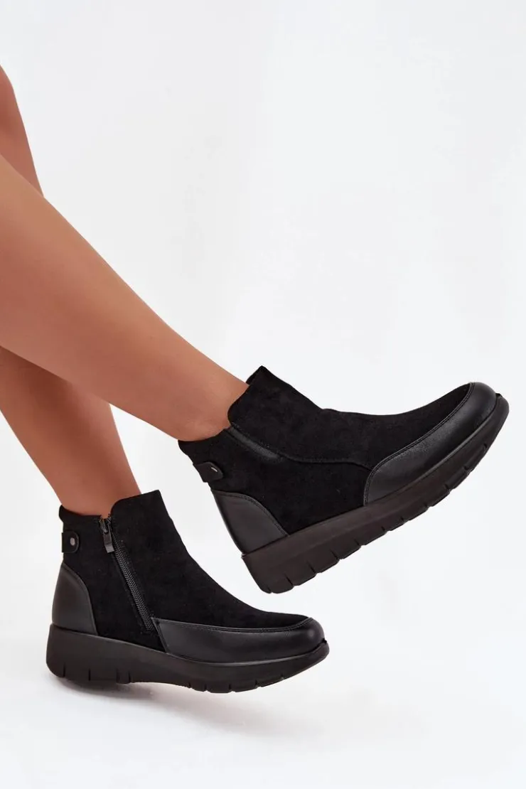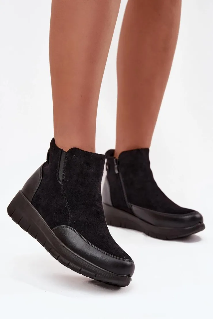 Botki damskie wykonane z połączenia eko zamszu i eko skóry. Model został osadzony na platformie, co zapewnia wygodę i stabilność podczas chodzenia. Wnętrze wykończono grubym futerkiem, które skutecznie chroni przed zimnem i gwarantuje komfort w mroźne dni. Zaokrąglone noski nadają całości klasycznego wyglądu, a praktyczne zapięcie na zamek ułatwia zakładanie i zdejmowanie. To botki, które świetnie sprawdzą się w codziennym użytkowaniu, oferując jednocześnie ciepło, wygodę i modny styl w sezonie jesienno-zimowym. Przy wyborze rozmiaru prosimy sugerować się tabelą rozmiarów.