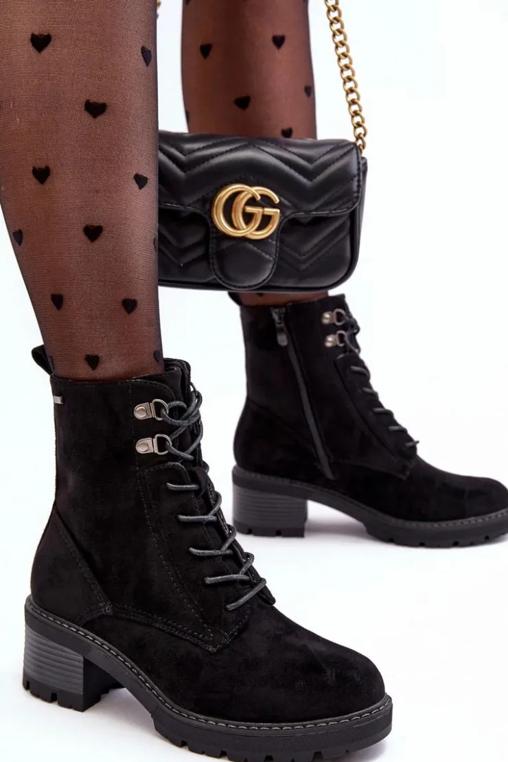 Botki damskie wykonane z eko zamszu. Osadzone na niskim, stabilnym obcasie. Zapinane z boku cholewki na suwak. Z przodu sznurowanie. Środek ocieplony kocem obuwniczym. Noski zaokrąglone. Model ten będzie idealnym uzupełnieniem jesienno-zimowych stylizacji! Przy wyborze rozmiaru prosimy sugerować się tabelą rozmiarów.