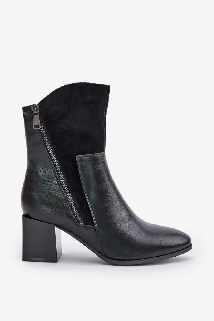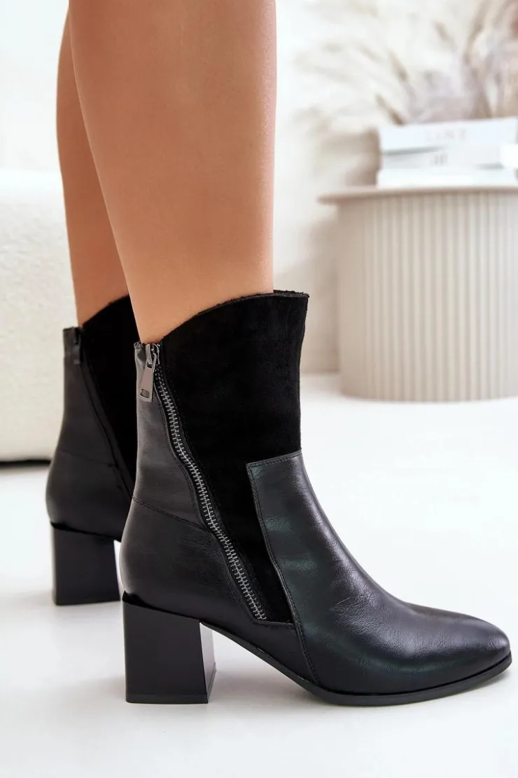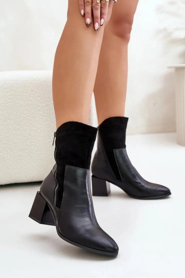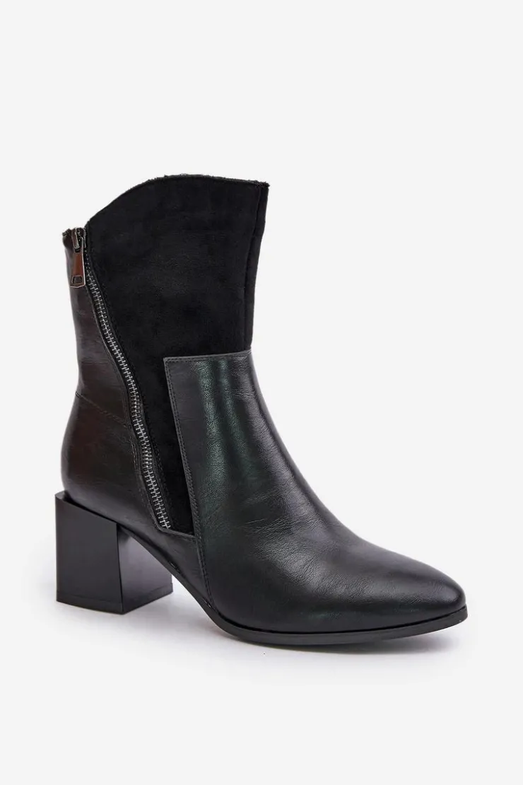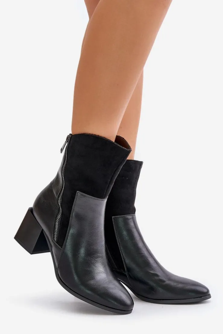 Damskie botki wykonane z eko skóry, osadzone na stabilnym obcasie typu słupek. Zapinane na zamek, z dodatkowym ozdobnym suwakiem, który dodaje charakteru. Wnętrze ocieplone kocem obuwniczym, zapewniającym ciepło i wygodę w chłodniejsze dni. Idealny wybór dla kobiet ceniących styl i komfort. Przy wyborze rozmiaru prosimy sugerować się tabelą rozmiarów.