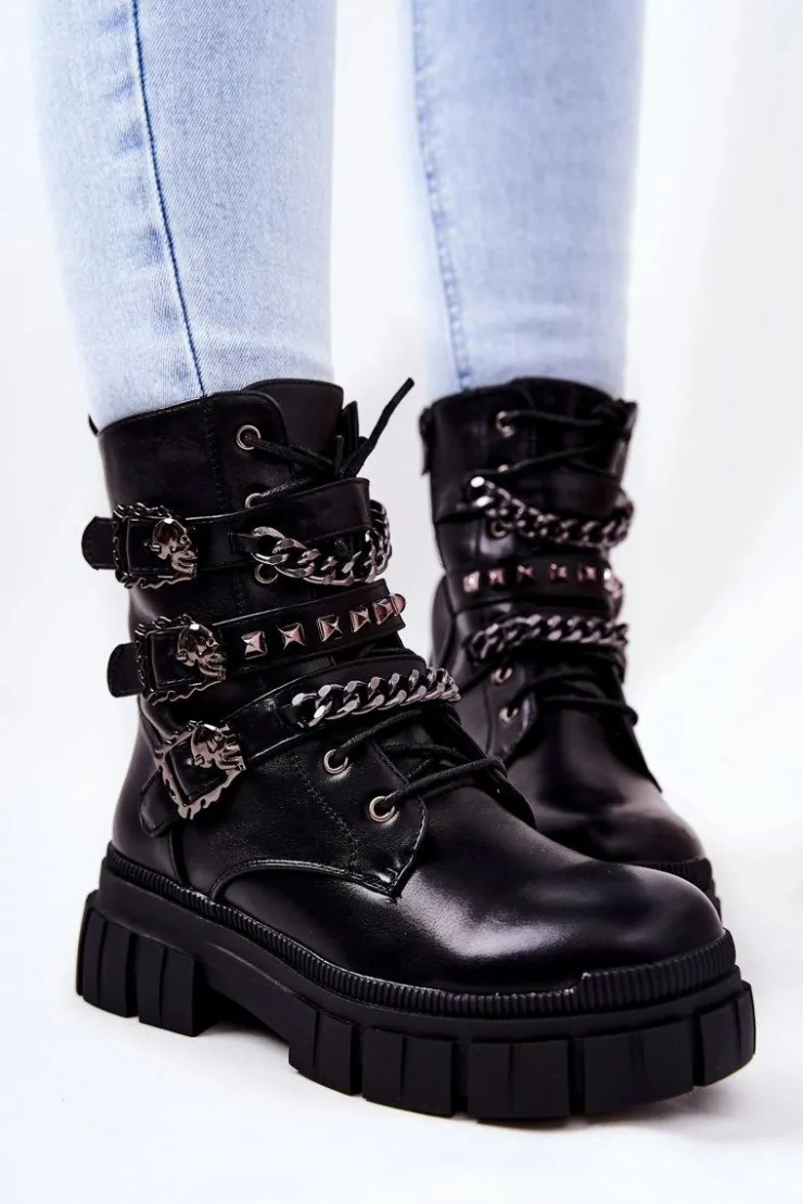 Boto Botki Sznurowane|Czarne Botki*Botki Wiązane Łańcuch Sprzączka Czarne Reiloy