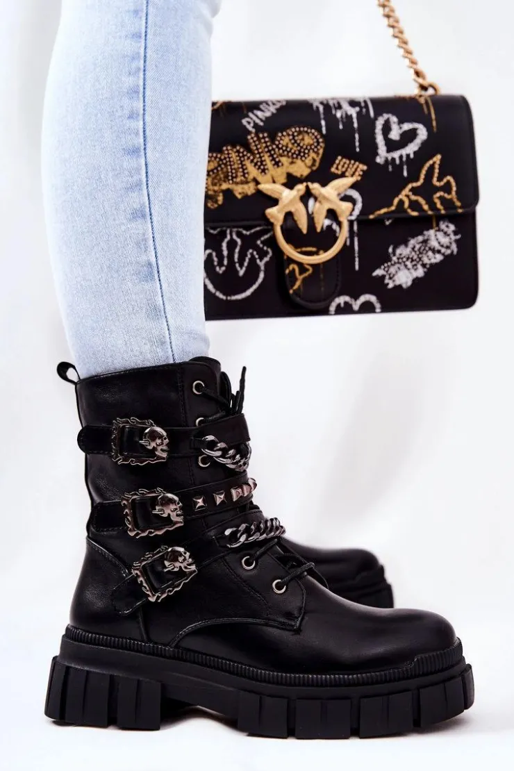 Wyjątkowe botki wykonane ze skóry ekologicznej. Posiadają wiązanie oraz suwak ułatwiający zakładanie obuwia. Z boku cholewki znajdują się sprzączki z motywem czaszki, na które są zapinane paski z ozdobnymi łańcuszkami i ćwiekami. Świetne botki, które nadadzą charakteru Twojej stylizacji! Przy wyborze rozmiaru prosimy sugerować się tabelą rozmiarów.