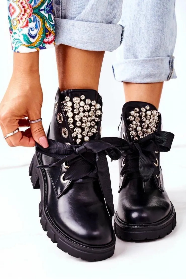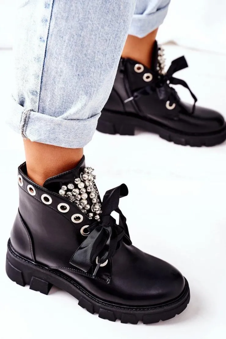 Wyjątkowe botki damskie wykonane z eko skóry. Wnętrze ocieplone jest miłym w dotyku kocem obuwniczym. Model wyróżnia się krojem cholewki oraz ozdobami. Przy wyborze rozmiaru prosimy sugerować się tabelą rozmiarów.