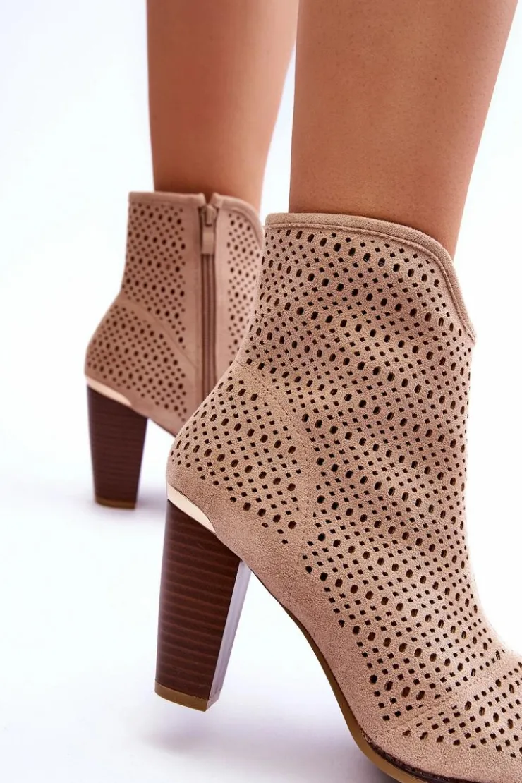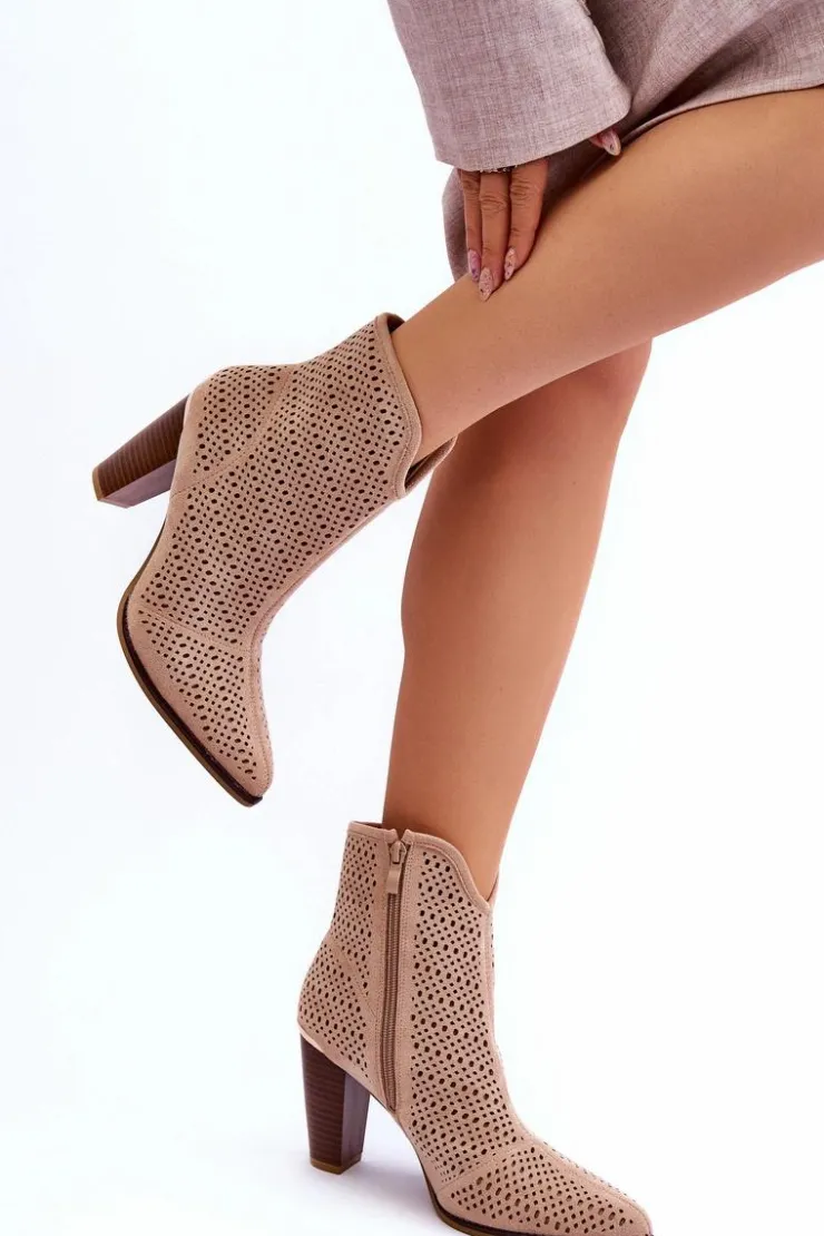 Cudowne, damskie botki z cholewką zapinaną na suwak. Buty te zostały wykonane z ekologicznego zamszu z ażurowym wzorem na całości cholewki. Eko skórzana wkładka oraz usztywniany zapiętek zapewniają wygodne użytkowanie. Botki osadzono na obcasie w postaci słupka ze zdobieniem. Świetny model do wielu stylizacji! Przy wyborze rozmiaru prosimy sugerować się tabelą rozmiarów.
