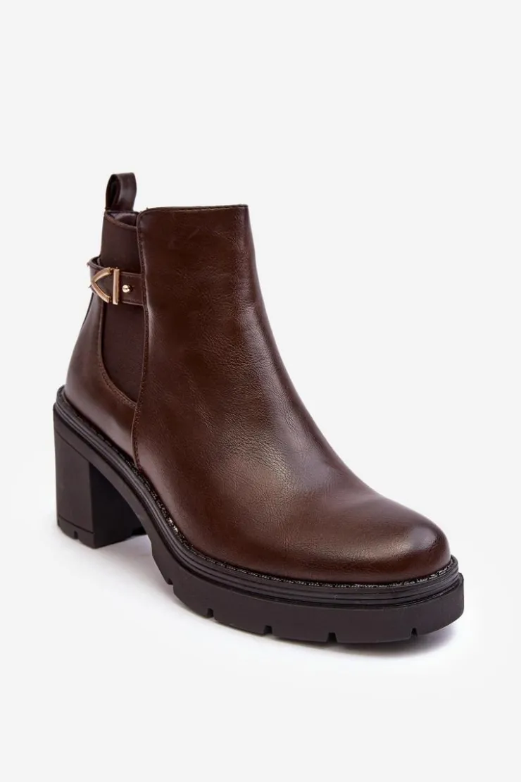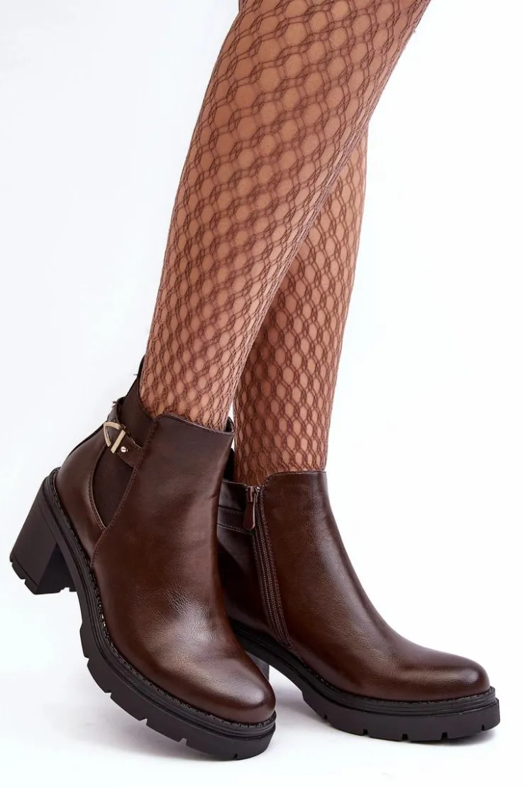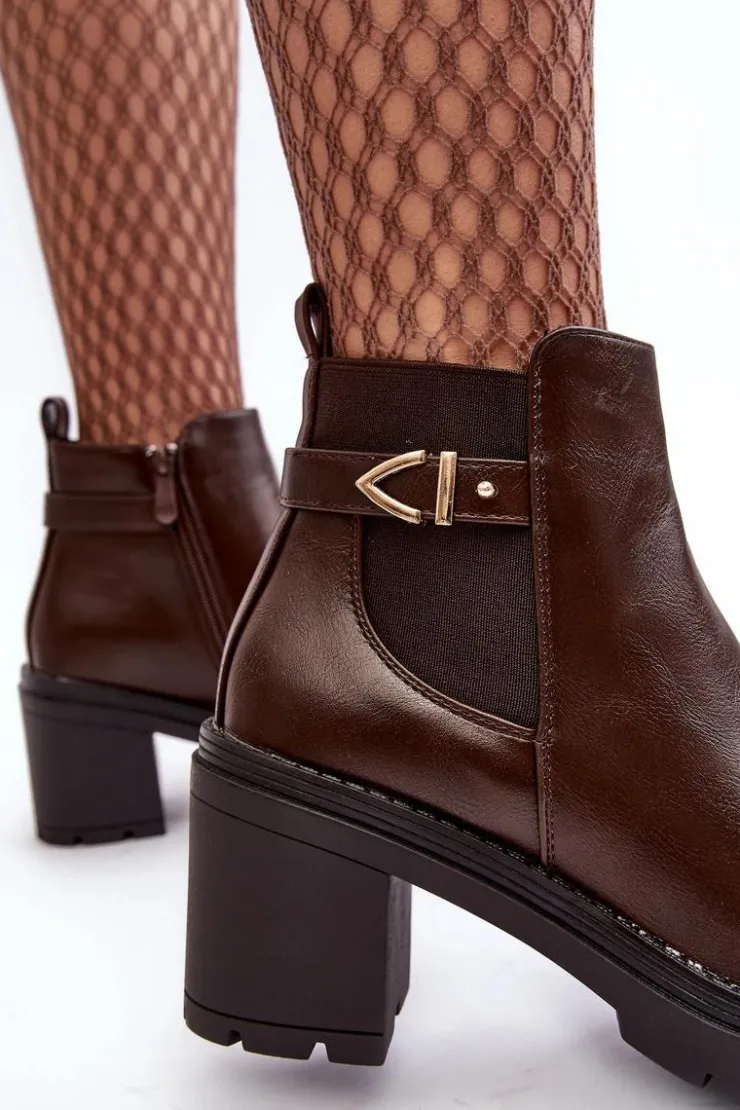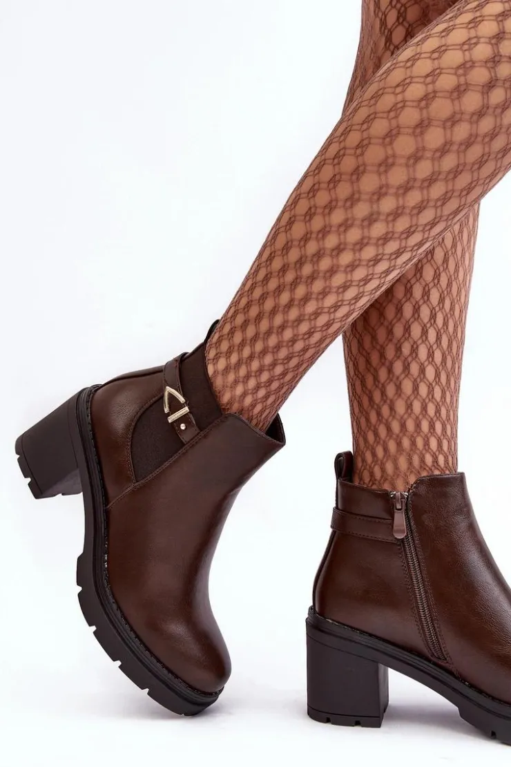 Damskie botki zostały wykonane z eko skóry. Osadzone na obcasie w postaci stabilnego, masywnego słupka. Cholewka została ozdobiona paskiem oraz elastyczną gumą pozwalającą na odpowiednie dopasowanie obuwia do tęgości nogi. Wewnątrz botki nie posiadają ocieplenia. Dodatkowo zapiętek jest usztywniony. Model ten posiada suwak z boku cholewki. Przy wyborze rozmiaru prosimy sugerować się tabelą rozmiarów.