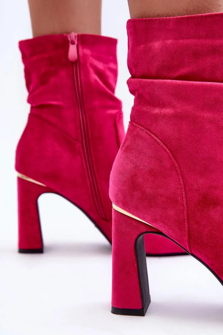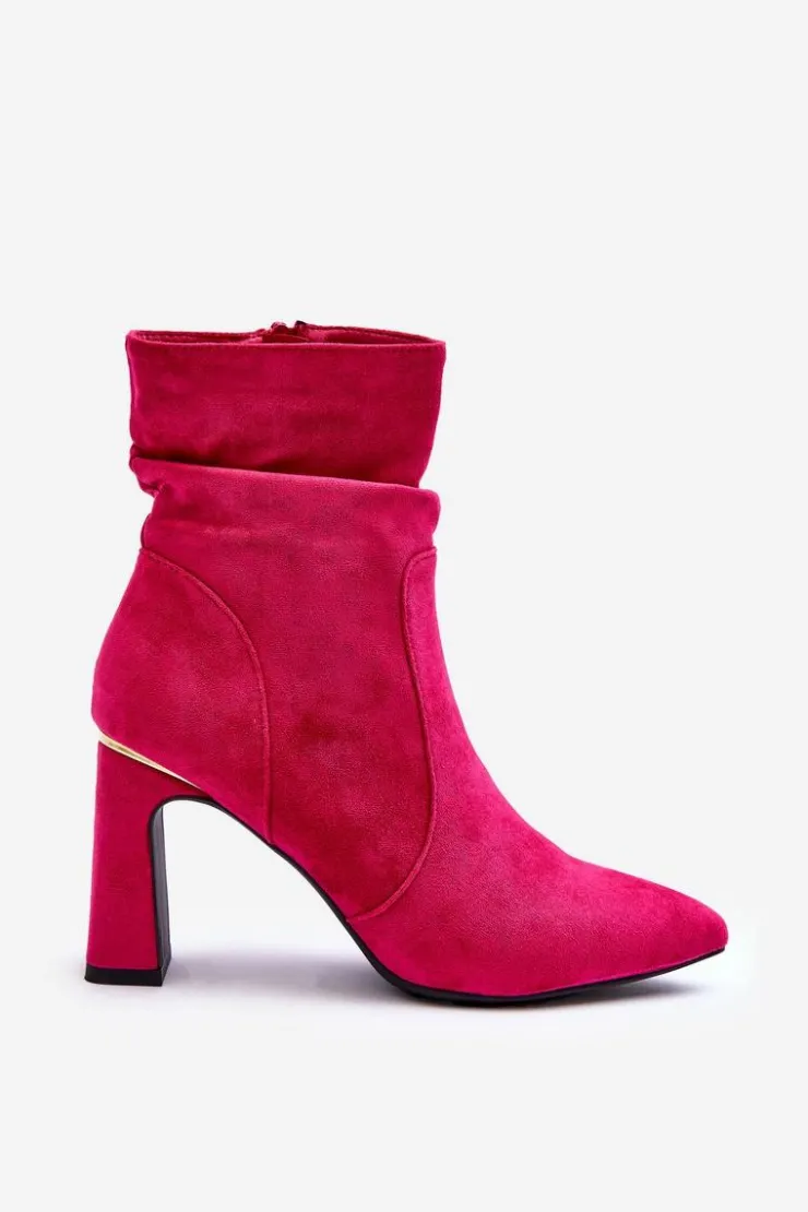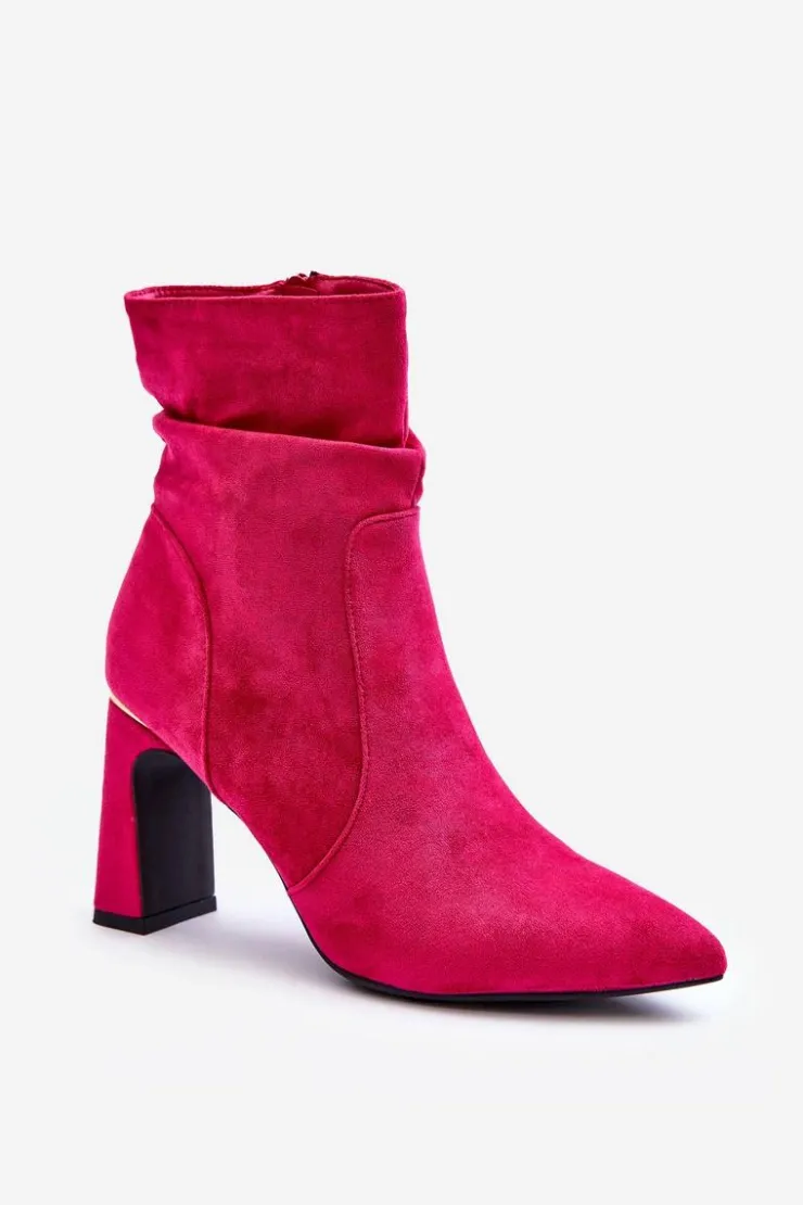 Eleganckie botki zostały wykonane z miłego w dotyku eko zamszu. Cholewka jest marszczona i zapinana na suwak. Model ten osadzony jest na obcasie w postaci słupka. Noski w szpic. Dodatkowo buty posiadają usztywniany zapiętek Przy wyborze rozmiaru prosimy sugerować się tabelą rozmiarów.