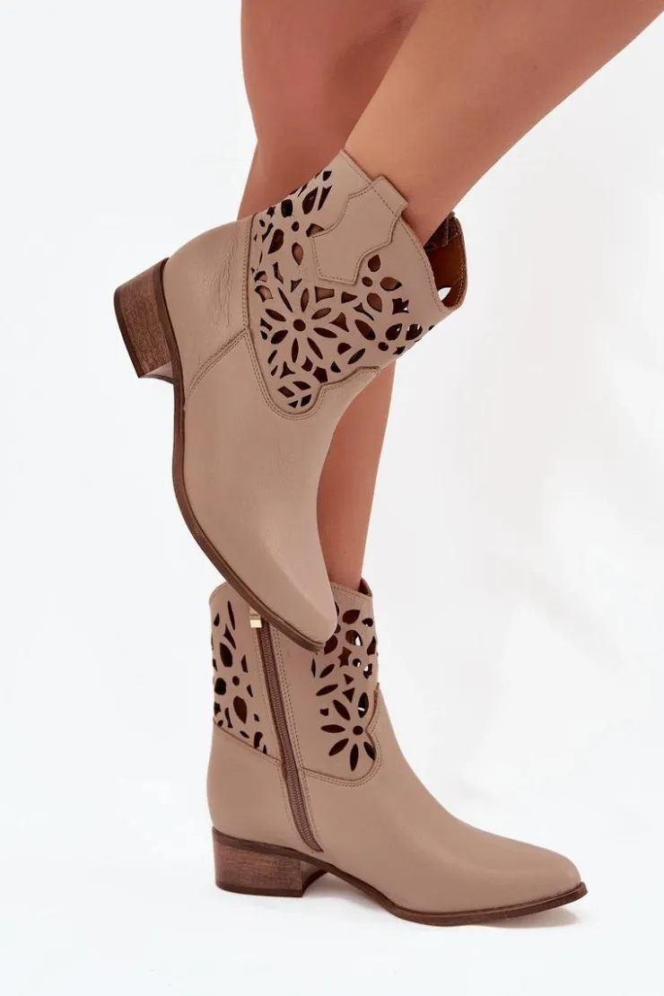 Botki damskie wykonane z naturalnej skóry. Osadzone na niskim obcasie, co sprawia, że są zarówno stylowe, jak i wygodne. Ażurowy wzorek na cholewce dodaje im elegancji. Model ten zapiany jest na zamek, co ułatwia zakładanie obuwia. Miękka wkładka gwarantuje komfort noszenia. Przy wyborze rozmiaru prosimy sugerować się tabelą rozmiarów.