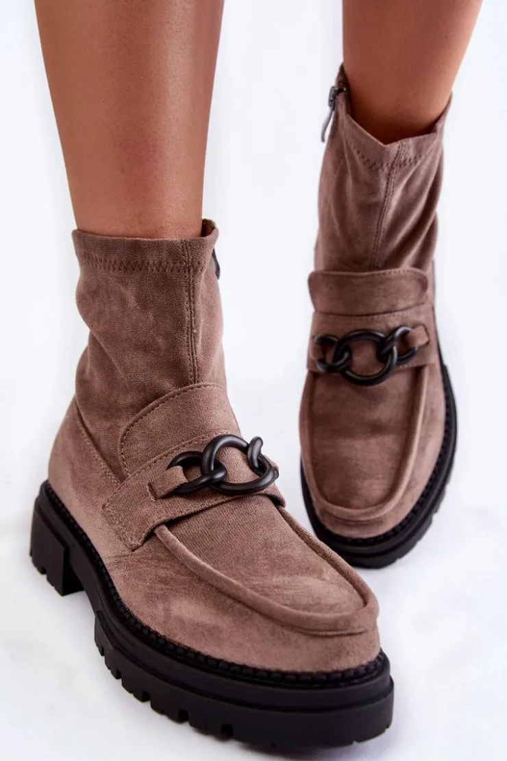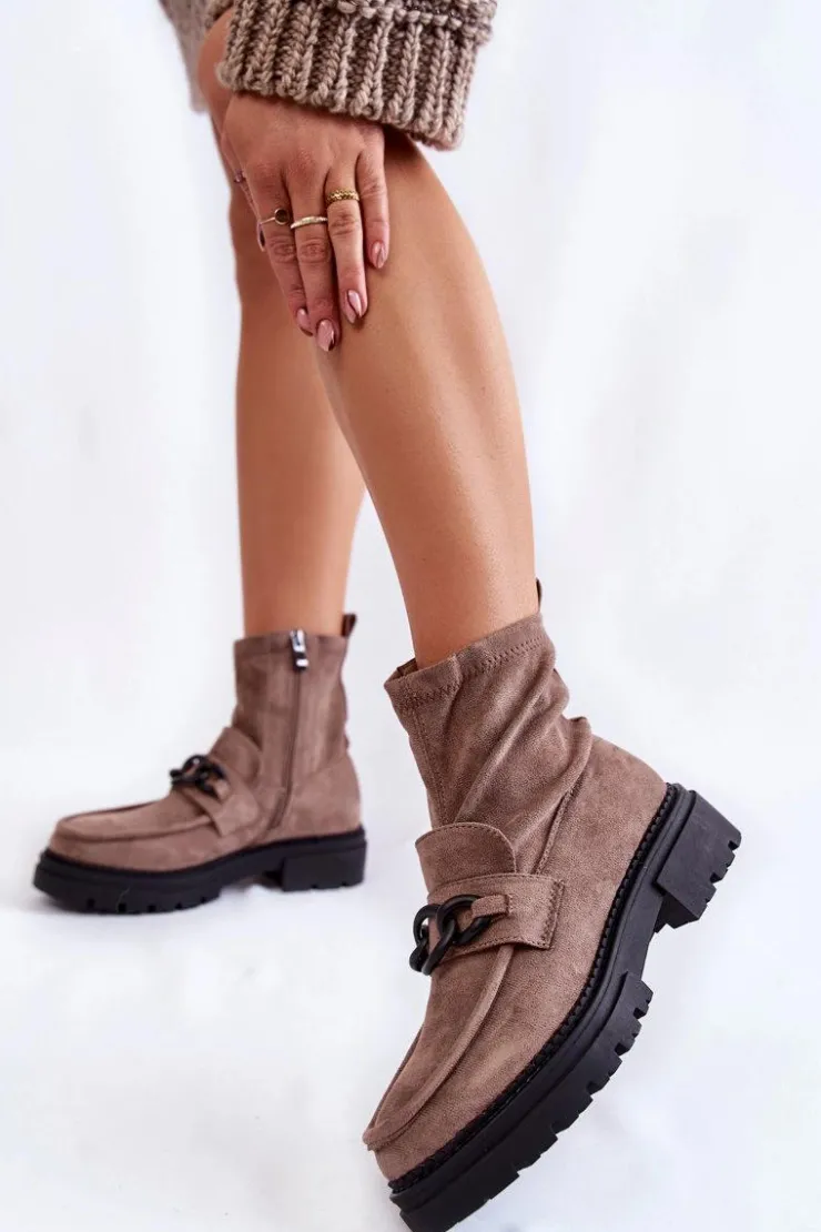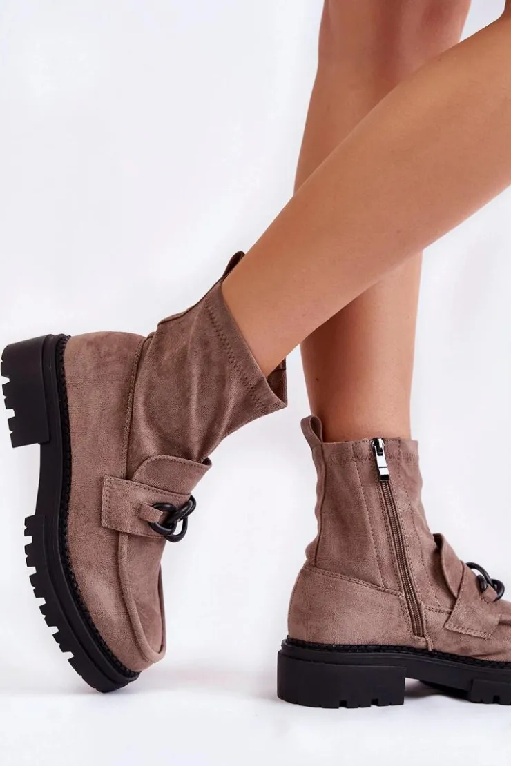 Damskie botki świetnie sprawdzą się w wielu stylizacjach! Wykonane ze skóry ekologicznej. Na boku cholewki posiadają suwak ułatwiający zakładanie obuwia. Botki osadzono na płaskim obcasie z platformą obszytą nicią. Wewnątrz, na wysokości stopy, zostały ocieplone miłym w dotyku kocem obuwniczym. Traperowa podeszwa zapewni stabilność na każdym kroku. Przy wyborze rozmiaru prosimy kierować się tabelą rozmiarów