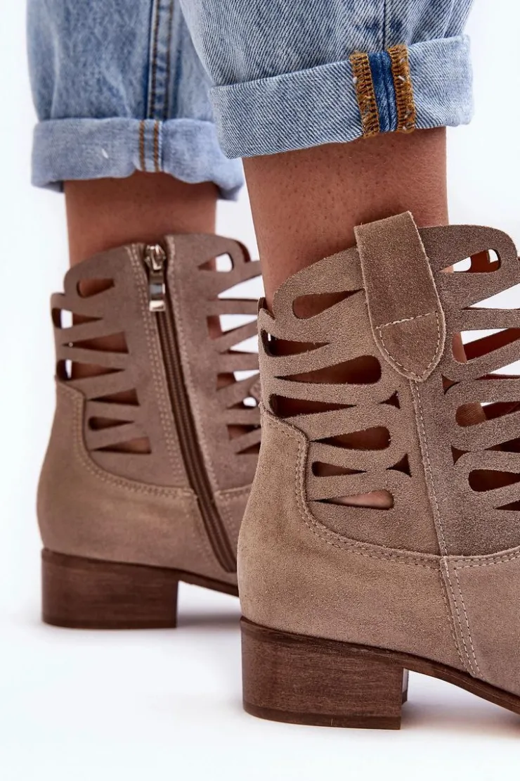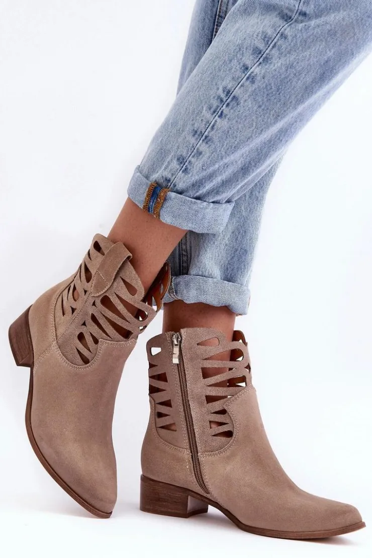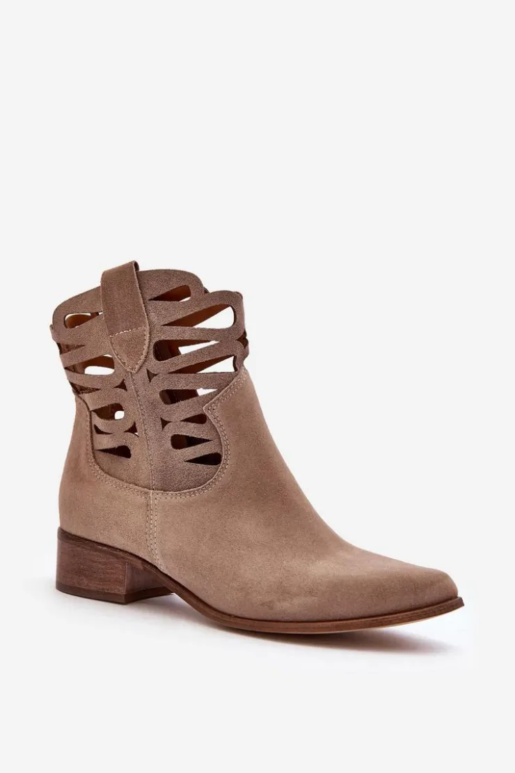 Damskie botki zostały wykonane z wysokiej jakości skóry naturalnej. Zapinane na suwak z boku. Osadzone na płaskim obcasie, co sprawia, że są niezwykle wygodne i stabilne. Noski w szpic optycznie wysmuklą nogi. Dodatkowo zapiętek jest usztywniony. Model ten posiada miękką wkładkę wykonaną z naturalnej skóry. Przy wyborze rozmiaru prosimy sugerować się tabelą rozmiarów.
