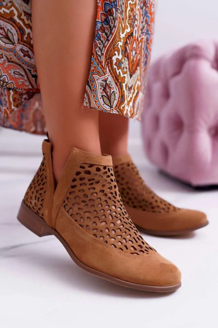 Przepiękne z wycięciami wykonane w całości z zamszowej skóry naturalnej. Jest to produkt Polski, wykonany ręcznie. Występują w dwóch kolorach, więc z pewnością znajdziesz tu swój ulubiony kolor. Ażurowe wykończenie na cholewce oraz zapiętku. Botki idealne sprawdzą się podczas ciepłych wiosennych dni. Przy wyborze rozmiaru prosimy sugerować się tabelą rozmiarów dostępną po najechaniu bądź kliknięciu na dany rozmiar.