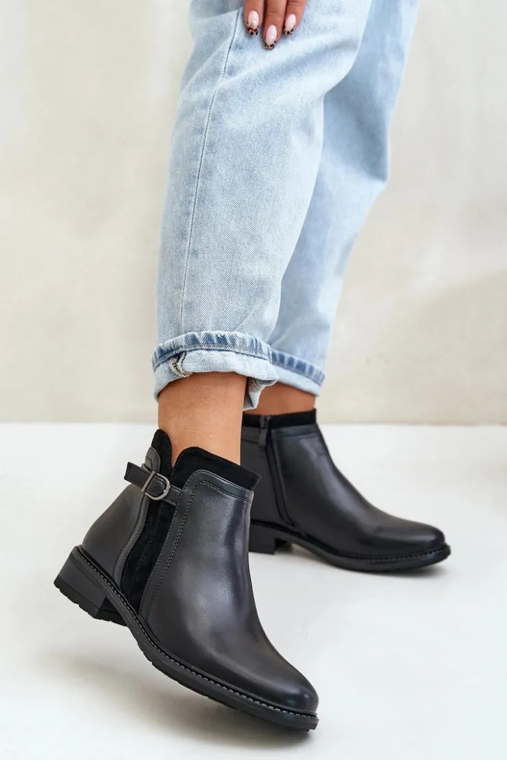 Klasyczne botki damskie świetnie sprawdzą się w wielu stylizacjach! Wykonane ze skóry ekologicznej. Osadzone na płaskim obcasie. Cholewka ozdobiona paskiem z małą ozdobą. Wnętrze ozdobione kocem obuwniczym. Noski zaokrąglone. Przy wyborze rozmiaru prosimy kierować się tabelą rozmiarów