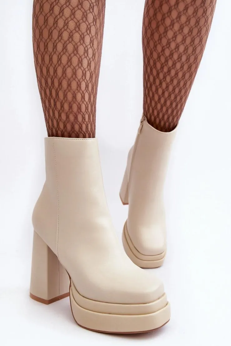 Masywne botki damskie wykonane z eko skóry. Osadzone na wysokim obcasie w postaci słupka i platformie. Noski w kwadrat. Zapiętek jest usztywniony. Model ten zapinany jest na suwak z boku. Botki te doskonale sprawdzą się w jesiennych stylizacjach. Przy wyborze rozmiaru prosimy kierować się tabelą rozmiarów