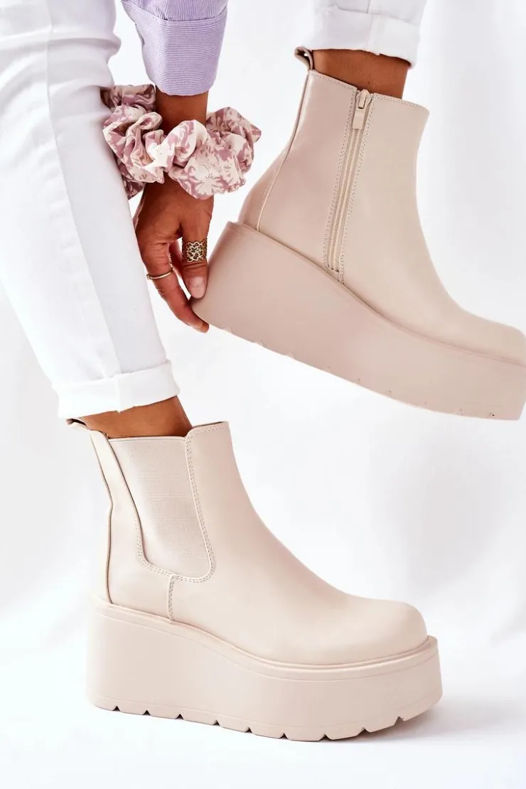 Botki damskie wykonane z eko skóry. Wnętrze botków ocieplone jest miłym w dotyku kocem obuwniczym. Wysoka platforma. Przy wyborze rozmiaru prosimy sugerować się tabelą rozmiarów.