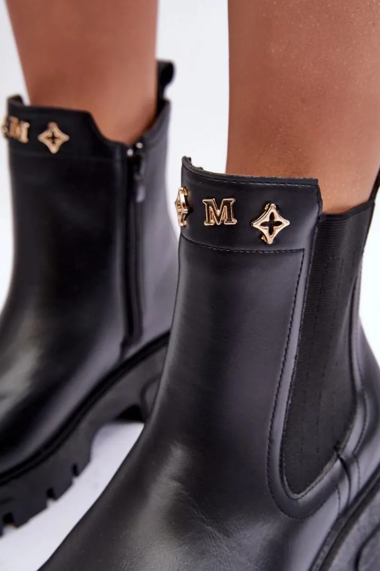 Klasyczne damskie botki osadzone na masywnym, płaskim obcasie oraz platformie. Wykonane z eko skóry. Wnętrze ocieplone kocem obuwniczym. Model zapinany na suwak. Na górze cholewki małe, złote ozdoby z tworzywa sztucznego. Koniecznie powinnaś mieć ten model w swojej szafie! Przy wyborze rozmiaru prosimy sugerować się tabelą rozmiarów.
