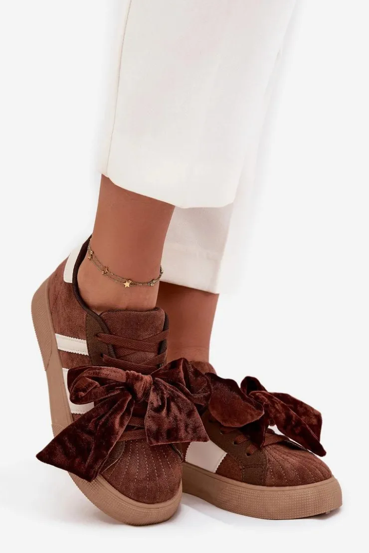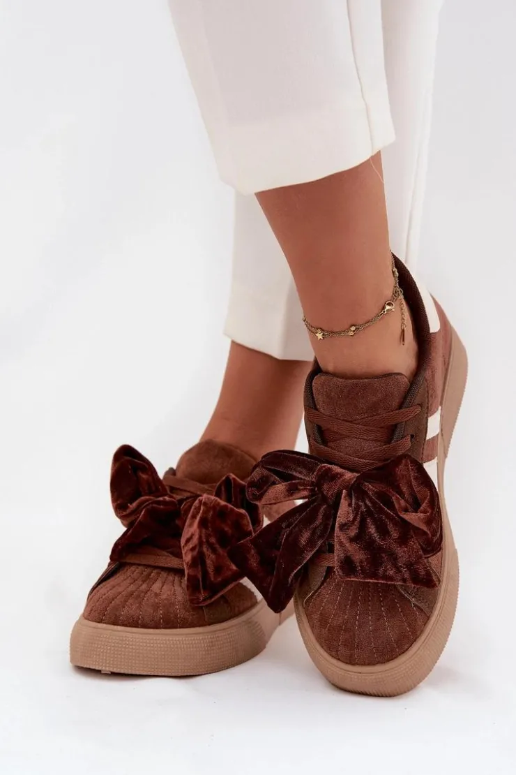 Sneakersy damskie wykonane z miękkiego eko zamszu to wygodne i jednocześnie stylowe obuwie na co dzień. Osadzone na platformie zapewniają komfort noszenia, a szerokie, zaokrąglone noski gwarantują swobodę dla stóp. Głównym atutem, który nadaje wyjątkowego charakteru, jest efektowna welurowa kokarda na sznurowaniu, która przyciąga spojrzenia i podkreślająca modny wygląd. To idealny model dla kobiet, które lubią łączyć sportową wygodę z kobiecymi detalami.