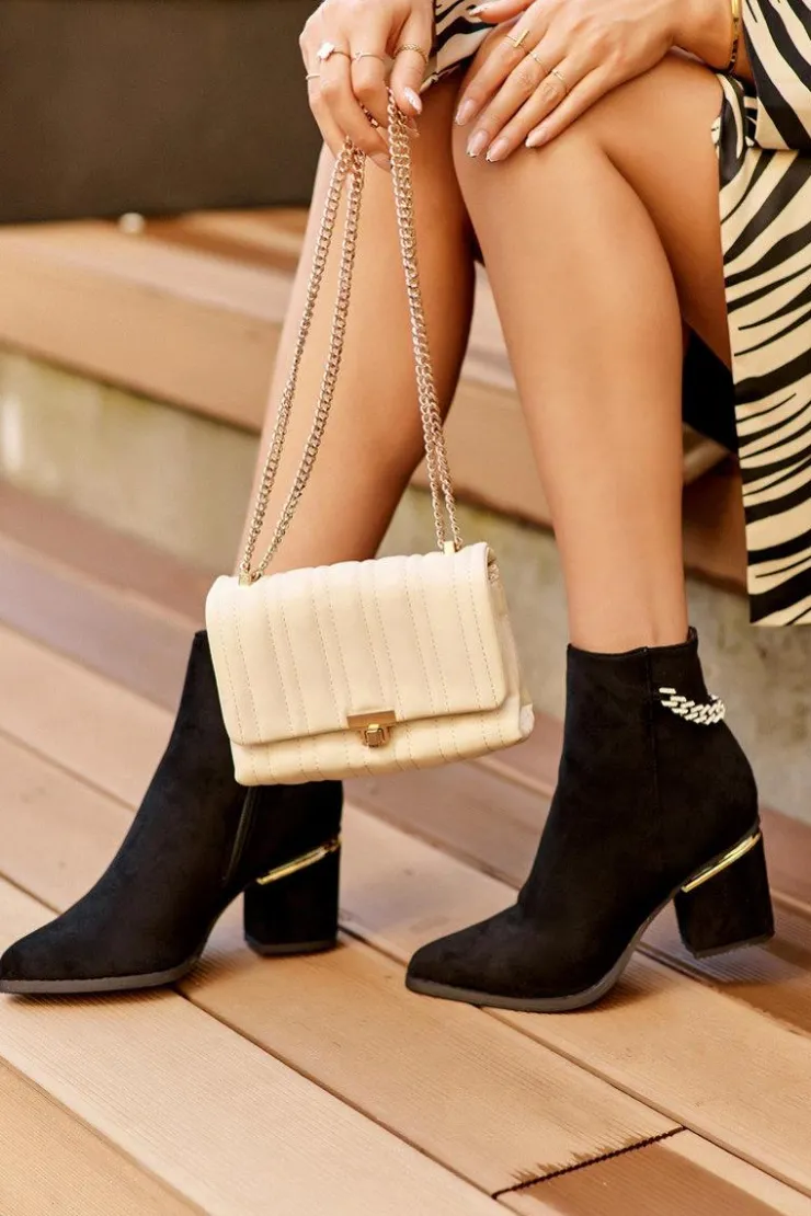 Eleganckie botki za kostkę zostały wykonane z miłego w dotyku eko zamszu. Osadzone na obcasie z lustrzanym elementem. Na cholewce biżuteryjna ozdoba. Model zapinany jest na suwak. Zapiętek usztywniony, wnętrze ocieplone kocem obuwniczym. Przy wyborze rozmiaru prosimy sugerować się tabelą rozmiarów.