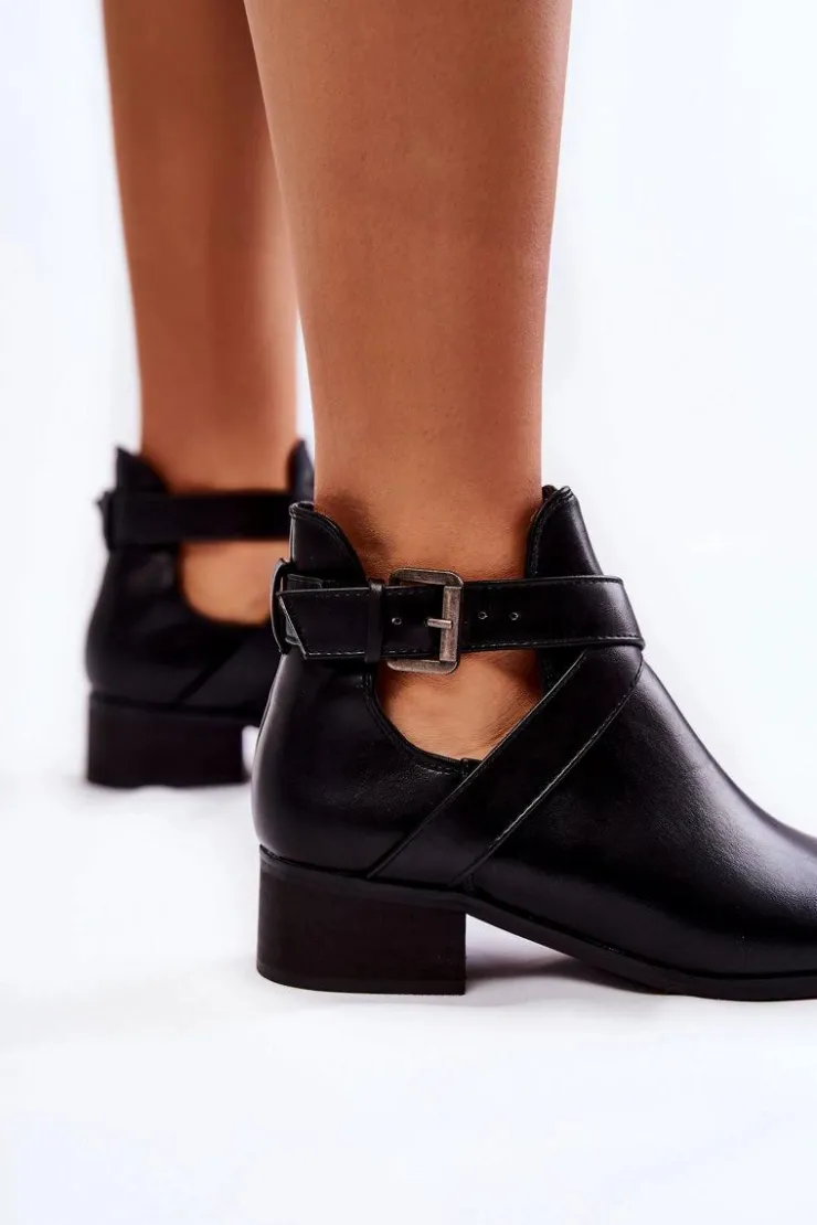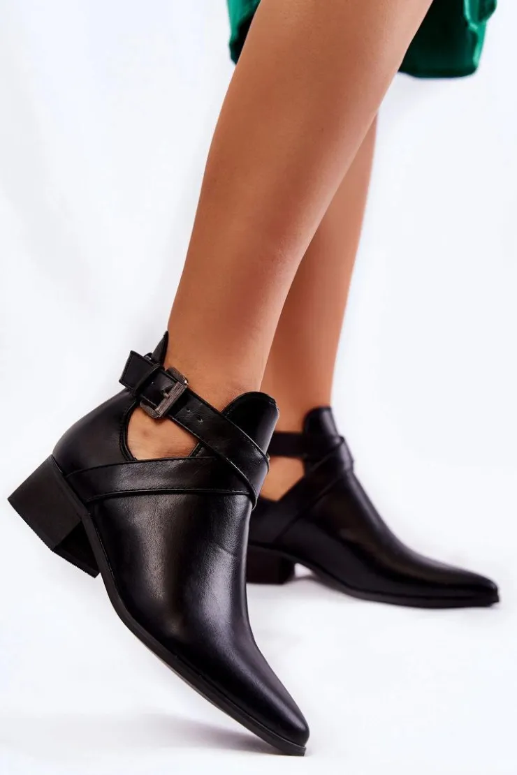 Damskie botki zostały wykonane z eko skóry. Posiadają nosek w szpic, który optycznie wysmukli nogi. Model ten posiada wycięcia z boku cholewki. Dodatkowo botki posiadają klamrę z regulowanym paskiem. Buty te zostały osadzone na płaskim obcasie. Nie są ocieplane. Posiadają usztywniany zapiętek. Kup już teraz! Przy wyborze rozmiaru prosimy sugerować się tabelą rozmiarów.