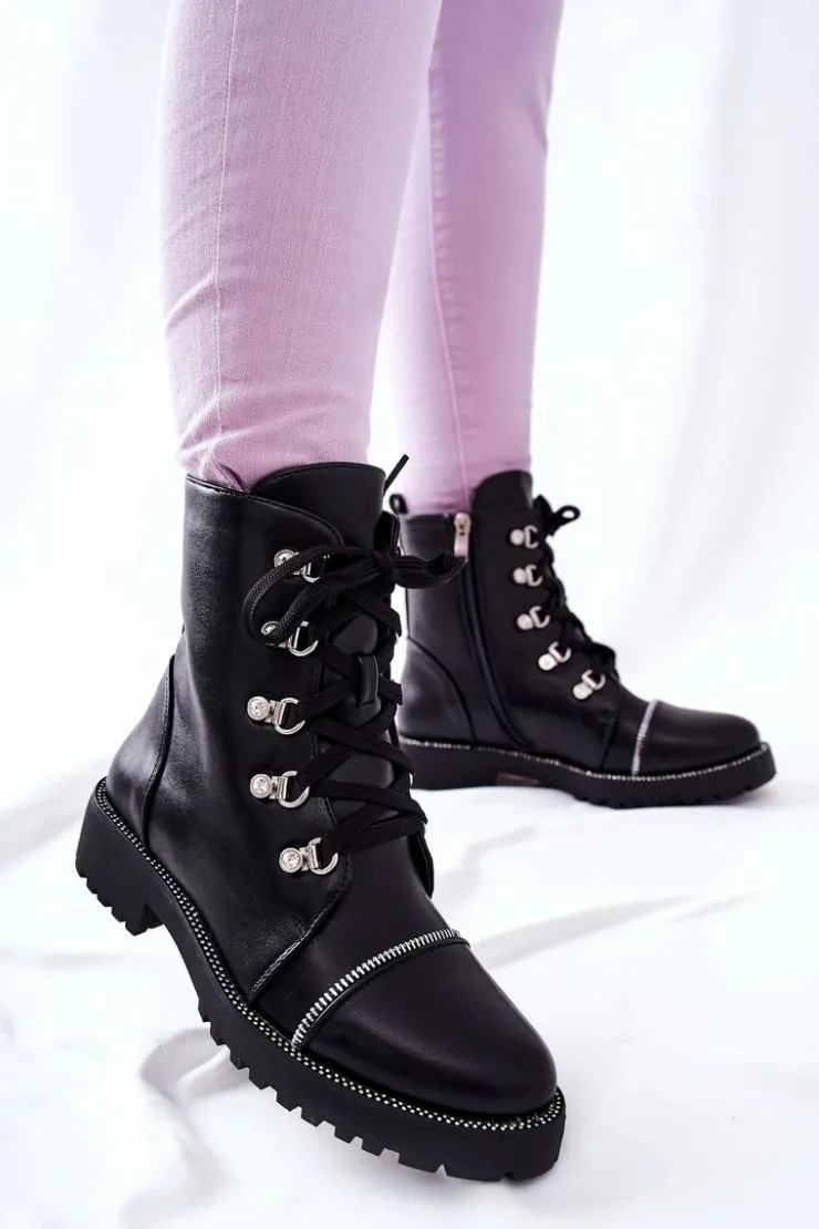 Klasyczne botki posiadają wiązanie oraz suwak ułatwiający zakładanie butów. Wykonane z eko skóry. Na przodzie widnieje część ozdobnego zamka błyskawicznego. Przy podeszwie są zdobione małymi cyrkoniami. Idealne na chłodne dni. Będą pasować do wielu stylizacji! Przy wyborze rozmiaru prosimy sugerować się tabelą rozmiarów.