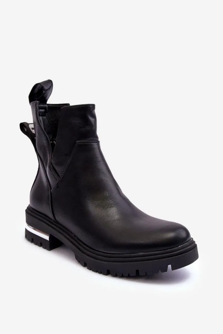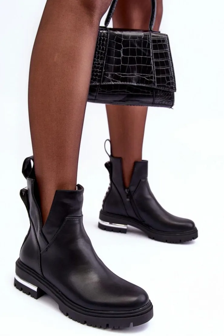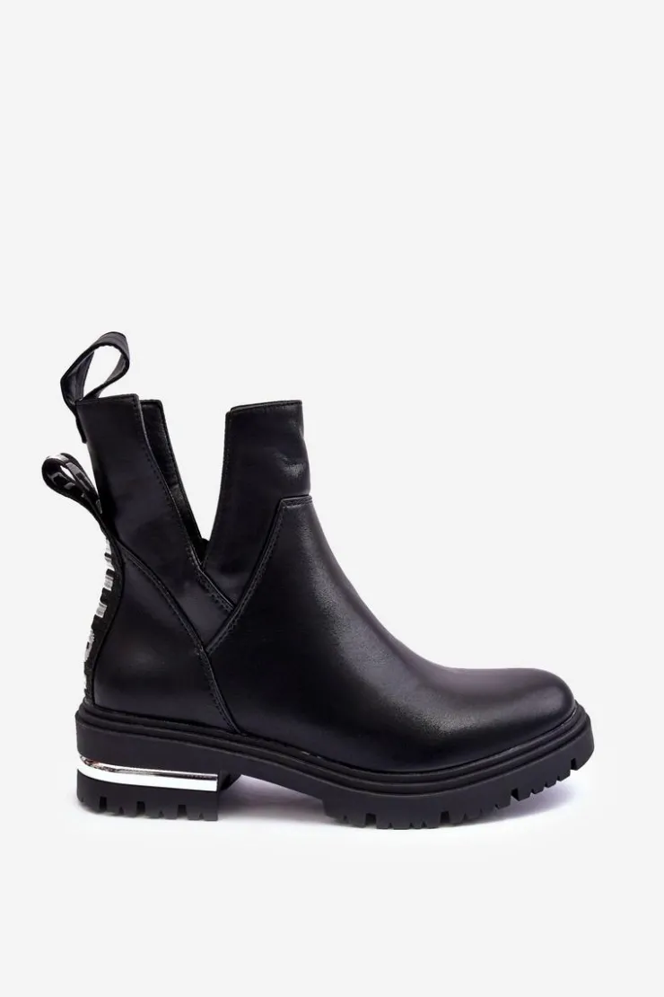 Botki damskie na płaskim obcasie. Wykonane z eko skóry. Wewnątrz ocieplone kocem obuwniczym. Cholewka z wycięciami na bokach. Na obcasie lustrzana ozdoba. Noski zaokrąglone. Model ten z tyłu cholewki posiada napis. Dodatkowo zapiętek jest usztywniony. Przy wyborze rozmiaru prosimy sugerować się tabelą rozmiarów.