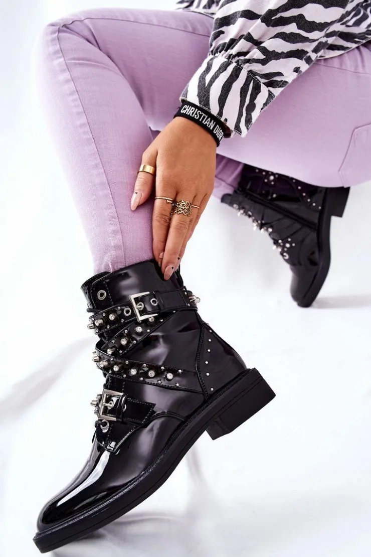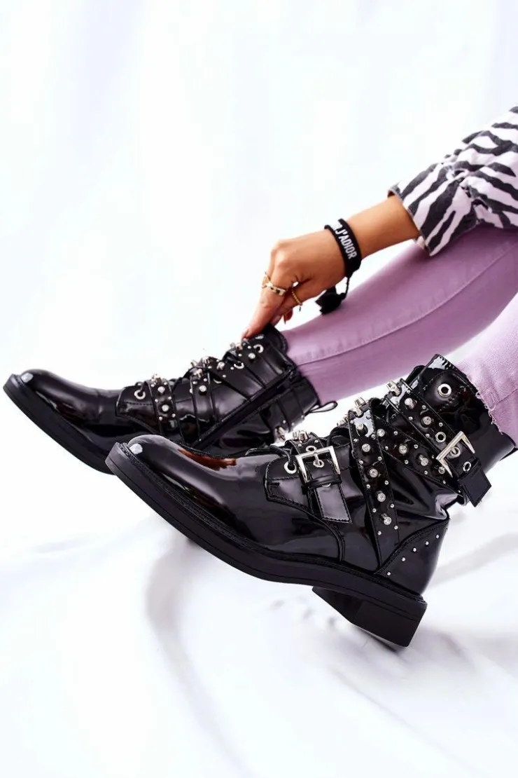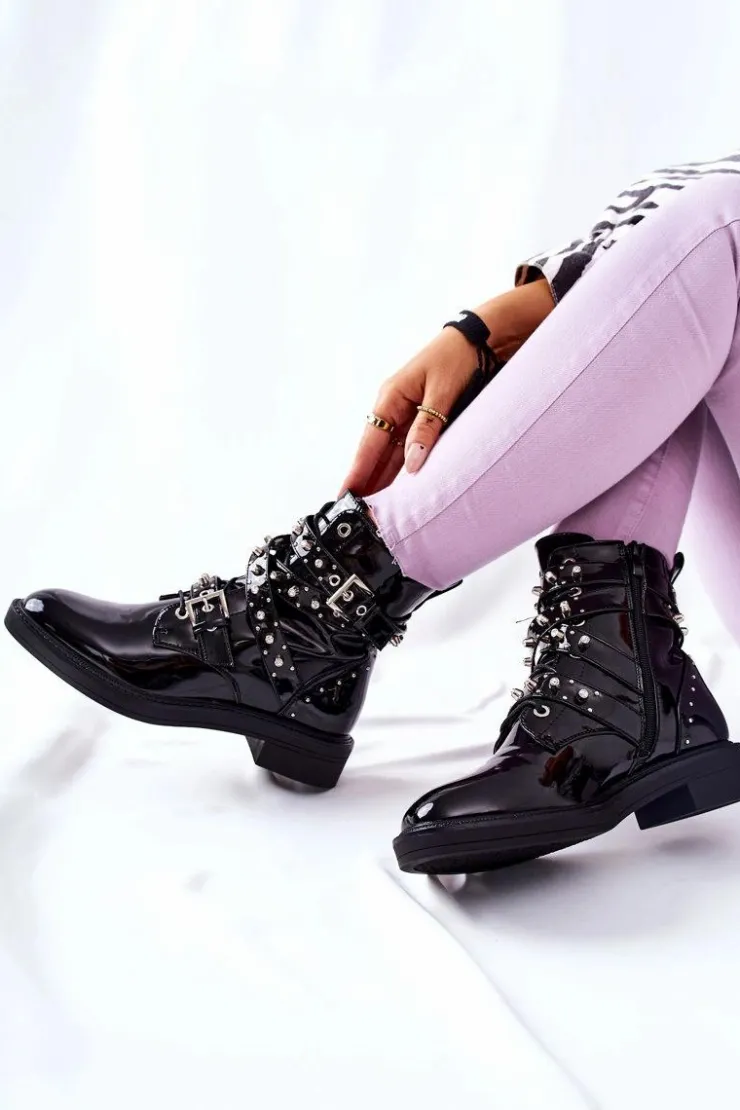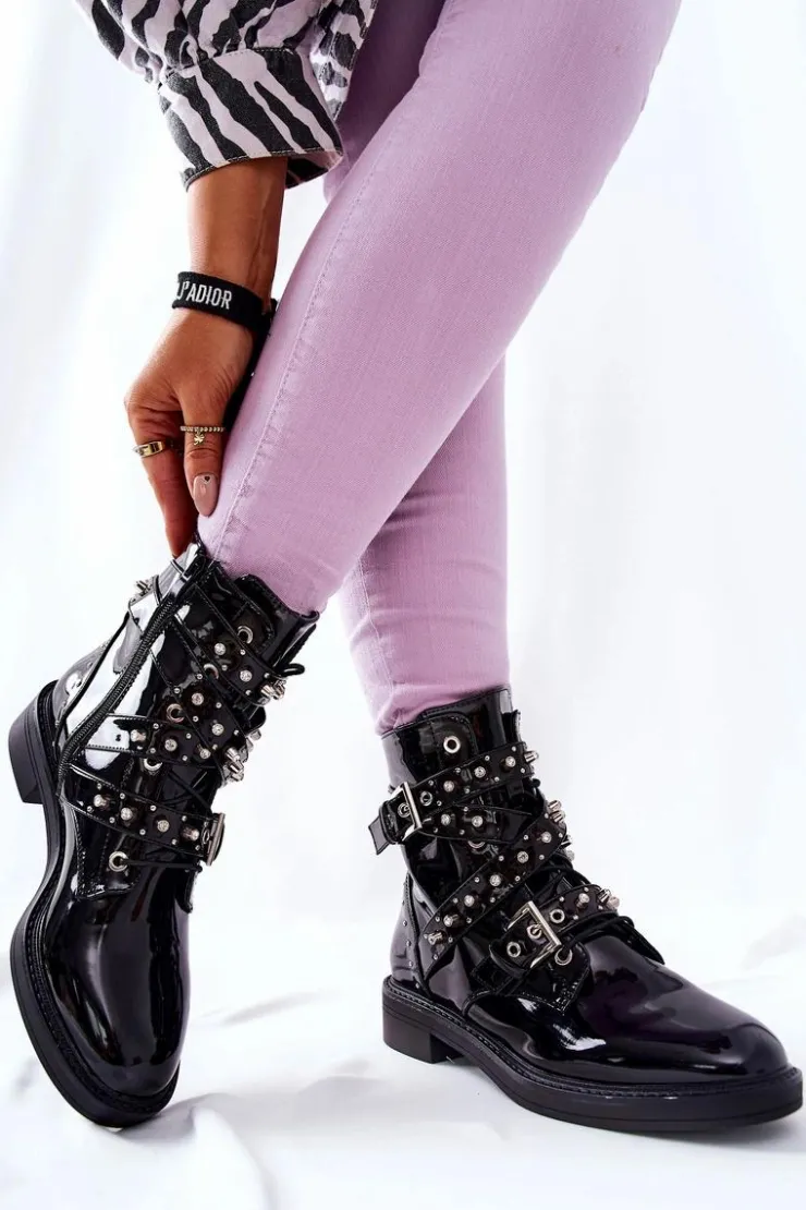 W jesienno-zimowych stylizacjach nie może zabraknąć botków! Model ten został wykonany z lakierowanej skóry ekologicznej. Cholewka zdobiona paskami z klamrami oraz cekinami. Wnętrze buta ocieplone zostało ciepłym i miłym w dotyku kocem obuwniczym. Botki są zapinane na zamek błyskawiczny oraz wiązane. Przy wyborze rozmiaru prosimy sugerować się tabelą rozmiarów.