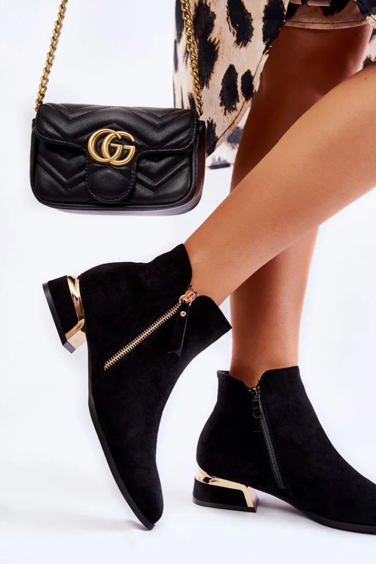 Botki damskie zostały wykonane z eko skórzanych materiałów. Posiadają nosek w szpic oraz ozdobny suwak po zewnętrznej stronie. Botki zostały ocieplone wewnątrz miłym w dotyku kocem obuwniczym. Osadzone na płaskim obcasie ozdobionym lustrzanym elementem. Zapiętek jest usztywniany. Zakładanie ułatwi wszyty suwak po wewnętrznej stronie. Przy wyborze rozmiaru prosimy sugerować się tabelą rozmiarów.