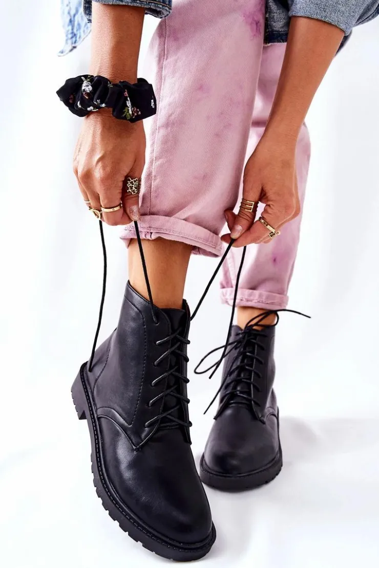 Klasyczne botki posiadają wiązanie oraz suwak ułatwiający zakładanie butów. Wykonane z eko skóry. Botki w środku posiadają na całości ocieplenie w postaci koca obuwniczego. Wiązanie w kolorze obuwia. Idealne na chłodne dni. Będą pasować do wielu stylizacji! Przy wyborze rozmiaru prosimy sugerować się tabelą rozmiarów.