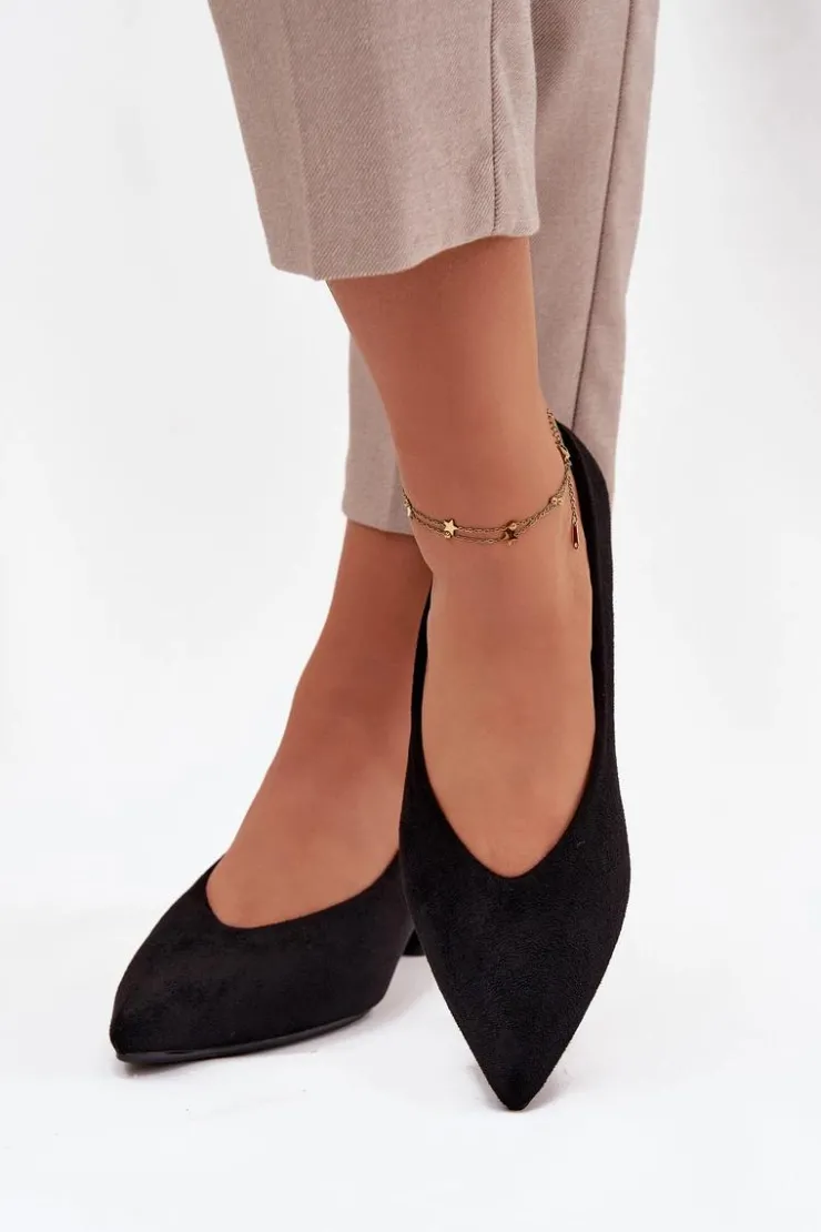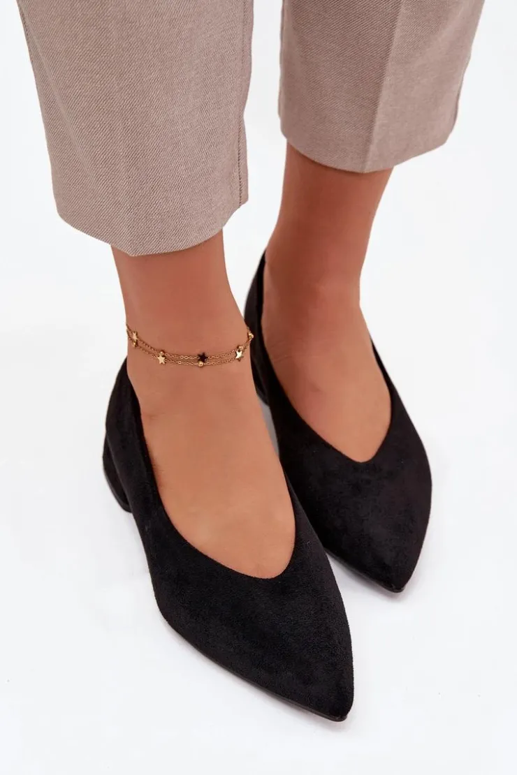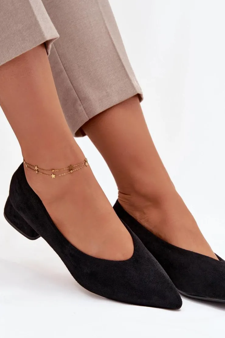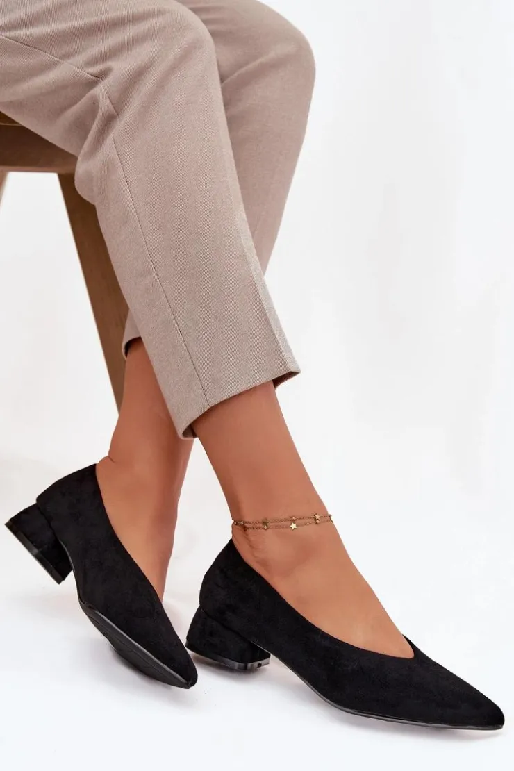 Czółenka wykonane z miękkiego eko zamszu to idealny wybór dla kobiet ceniących elegancję i komfort. Model na niskim, stabilnym obcasie typu klocek zapewnia wygodę nawet podczas długiego dnia, a szpiczasty nosek dodaje butom klasy i optycznie wysmukla nogi. Te uniwersalne czółenka doskonale sprawdzą się zarówno na specjalne okazje, jak i do pracy czy na wieczorne wyjścia. Świetnie komponują się ze spódnicami, sukienkami oraz eleganckimi spodniami, tworząc stylowy i kobiecy look. Przy wyborze rozmiaru prosimy sugerować się tabelą rozmiarów.