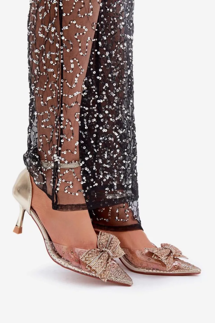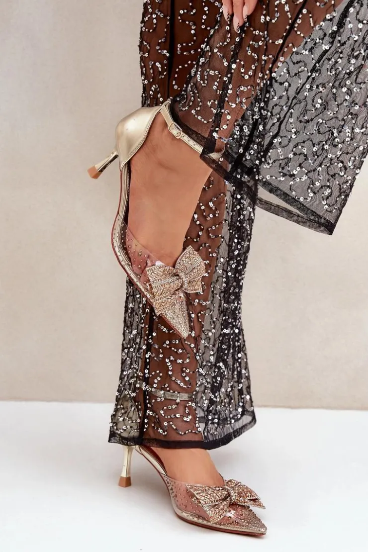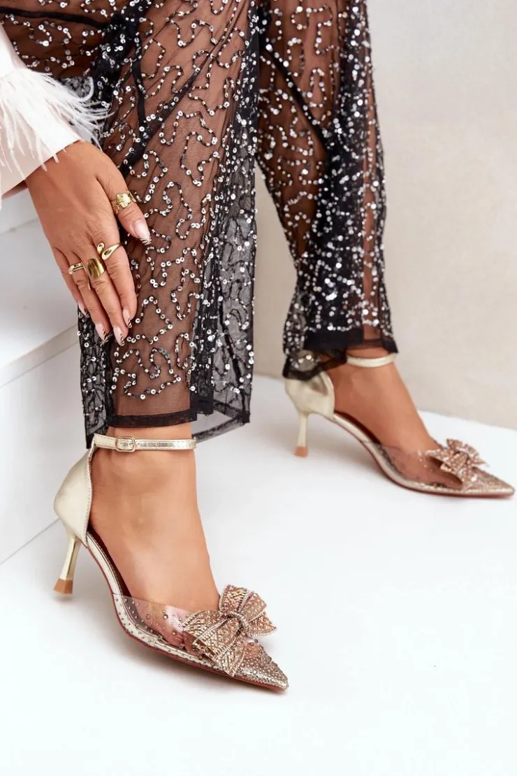 Stylowe szpilki damskie ozdobione efektowną kokardą z przodu, która nadaje im wyjątkowego uroku. Model z noskami w szpic, które optycznie wysmuklają nogi. Zapinane na regulowany pasek ze sprzączką, co zapewnia idealne dopasowanie i wygodę noszenia. Eleganckie i kobiece, doskonałe na wieczorowe wyjścia i specjalne okazje. Przy wyborze rozmiaru prosimy sugerować się tabelą rozmiarów.