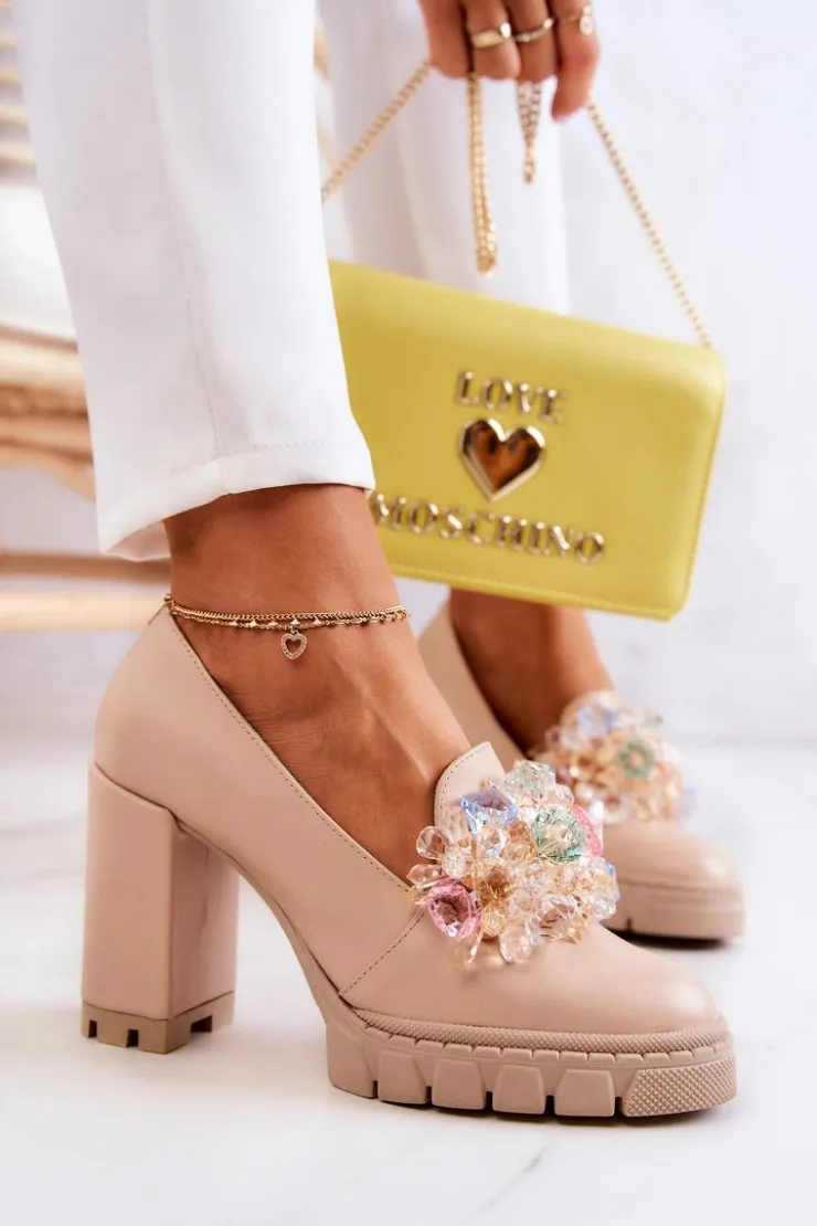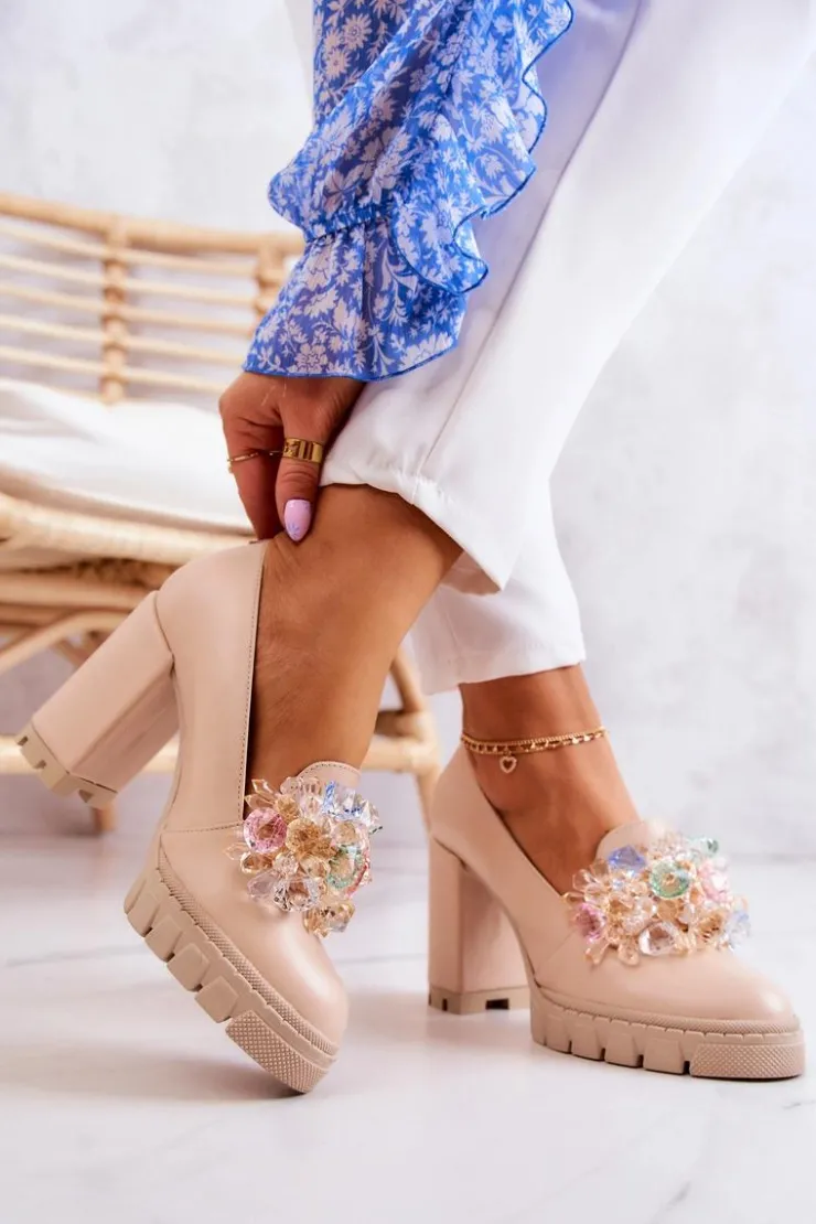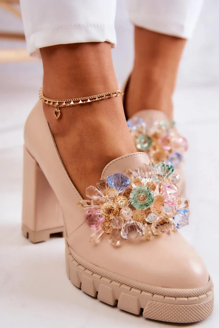 Cudne czółenka na masywnym obcasie w postaci słupka oraz platformie. Traperowa podeszwa sprawia, że te buty są wygodne i stabilne podczas użytkowania. Posiadają ozdobę w postaci imitacji barwnych kryształków z przodu obuwia. Miękka wkładka została wykonana z naturalnej skóry. Komfort to podstawa! Modny fason zachwyci niejedną miłośniczkę wysokich obcasów! Koniecznie powinnaś mieć ten model w swojej kolekcji obuwia! Przy wyborze rozmiaru prosimy sugerować się tabelą rozmiarów.
