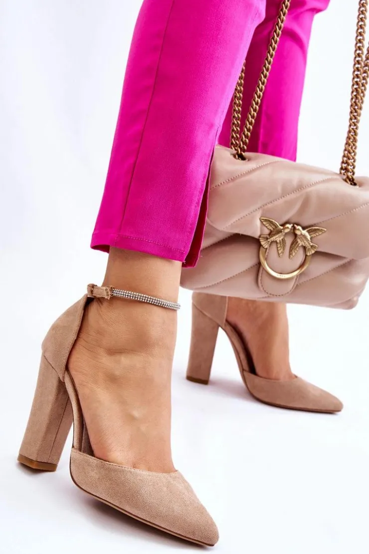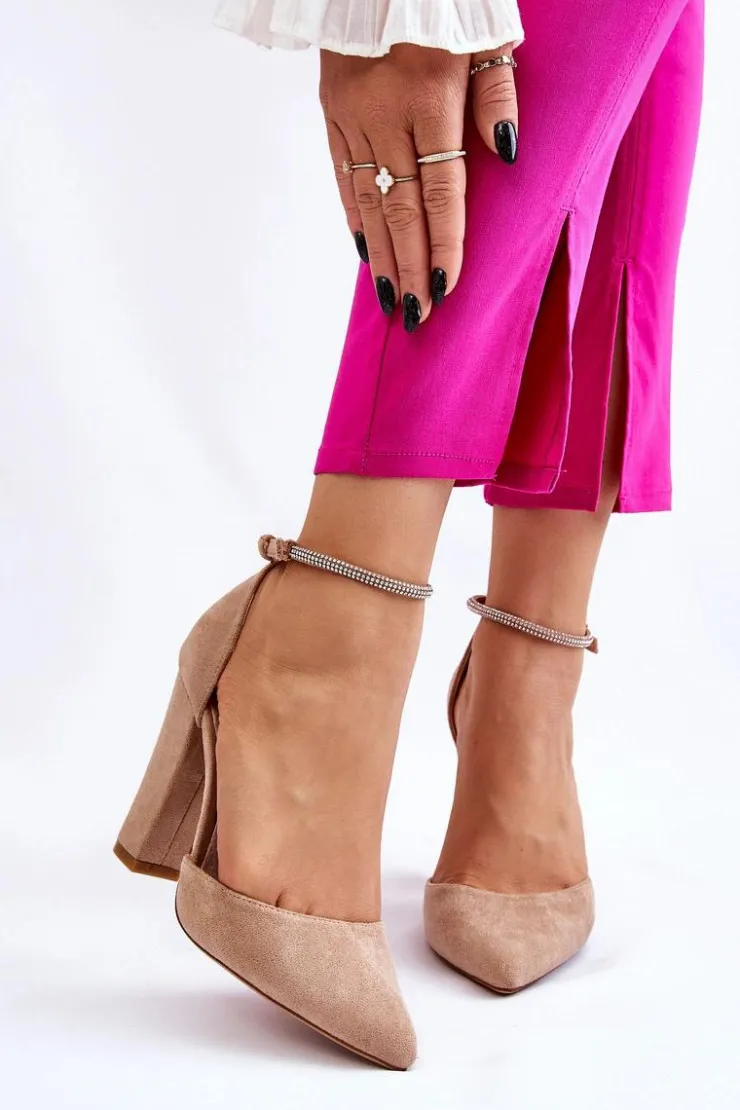 Klasyczne czółenka osadzone na wysokim obcasie w postaci słupka. Zapinane na regulowany pasek ze sprzączką znajdującą się na wysokości kostki z dodatkową gumką. Model z noskiem w szpic. Buty te zostały wykonane z eko skóry. Model z usztywnianym zapiętkiem. Idealne do wieczorowych sukienek czy eleganckich kombinezonów. Świetnie sprawdzą się podczas wielu uroczystości. Przy wyborze rozmiaru prosimy sugerować się tabelą rozmiarów.