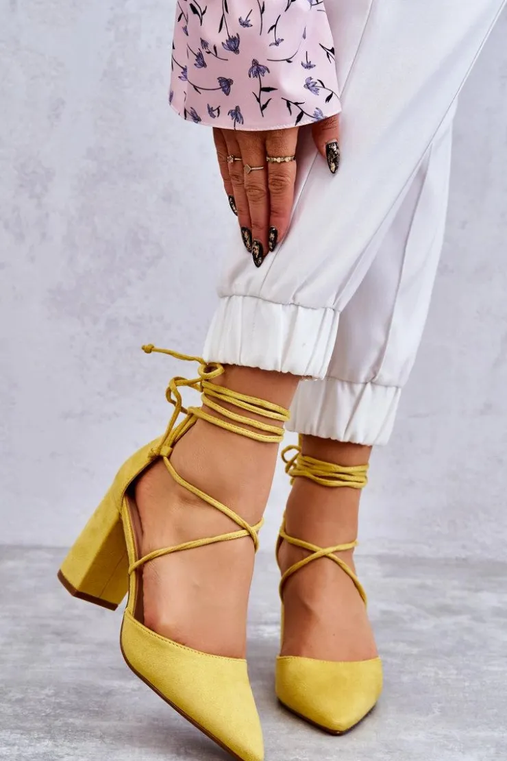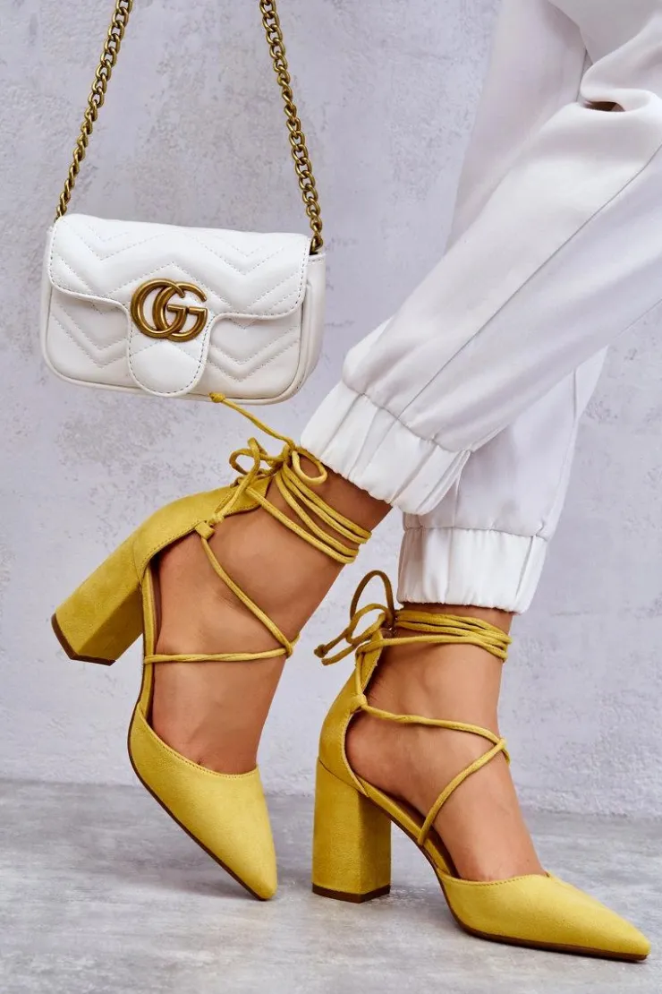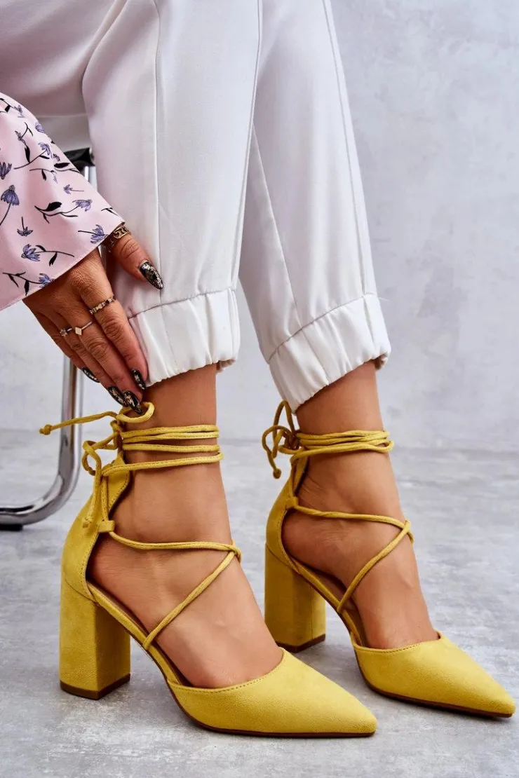 Klasyczne czółenka wykonane z eko skóry. Pięknie prezentują się na nodze. Osadzone na obcasie w postaci stabilnego słupka. Model wiązany wokół łydki. Nosek w szpic. Miękka, wykonana z eko skóry wkładka zapewni komfort na każdym kroku. Te modne czółenka doskonale będą komponować się z wieloma stylizacjami. Przy wyborze rozmiaru prosimy kierować się tabelą rozmiarów