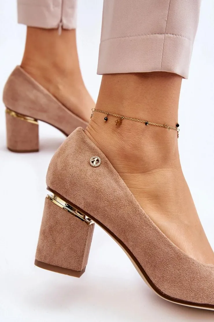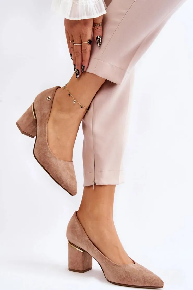 Piękne czółenka osadzone na obcasie w postaci słupka. Wykonane z zamszowej eko skóry. Nosek w szpic wysmukli nogi. Idealny model do wielu stylizacji. Buty są niezwykle komfortowe w użytkowaniu, dzięki wkładce z naturalnej skóry. Obcas został ozdobiony lustrzanym elementem. Przy wyborze rozmiaru prosimy sugerować się tabelą rozmiarów.