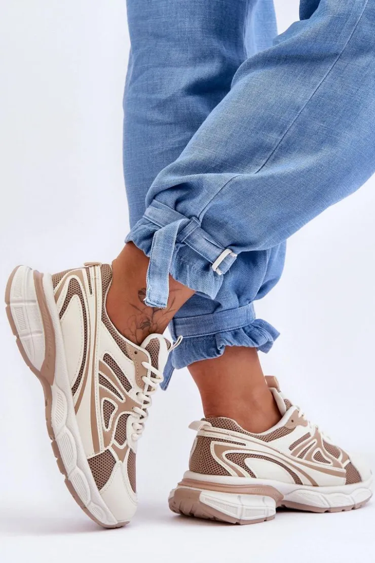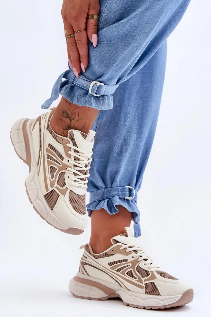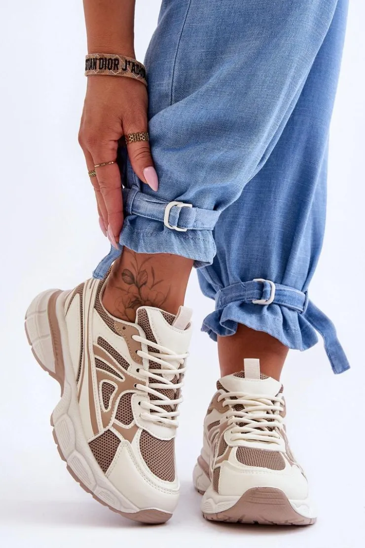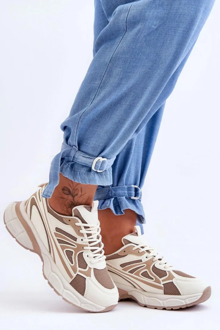 Damskie buty sportowe zostały wykonane z połączenia eko skóry oraz siateczkowego materiału tekstylnego. Model klasycznie sznurowany pozwoli na odpowiednie dopasowanie obuwia do tęgości nogi. Buty zostały osadzone na masywnej platformie z płaskim obcasem i antypoślizgową podeszwą. Wkładka z tkaniny zapewni komfortowe użytkowanie obuwia. Te modne sneakersy na pewno sprawdzą się w wielu stylizacjach! Przy wyborze rozmiaru prosimy sugerować się tabelą rozmiarów.
