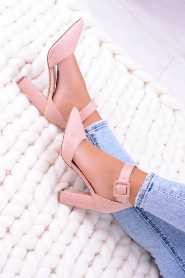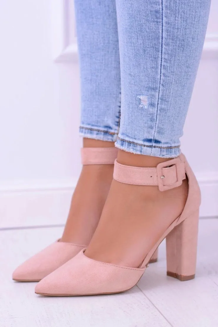 Elegancki i klasyczny model czółenek. Zamszowy materiał oraz wysoki słupek to podstawa dobrego obuwia. Wysokość obcasa wynosi 10 cm. Wkładka wykonana ze skóry ekologicznej w celu zapewnienia większego komfortu. Zapinane na pasek wokół kostki. Idealne na wszelkie okazje.