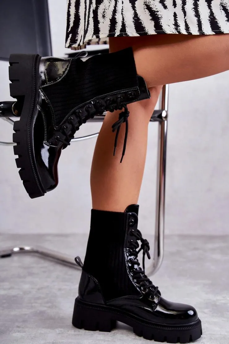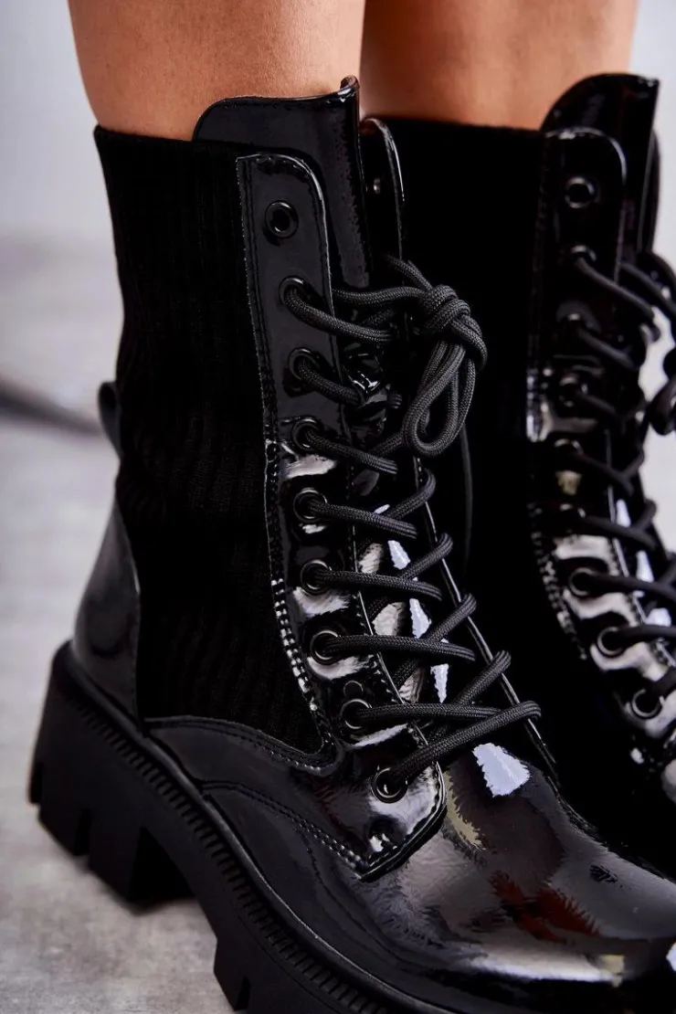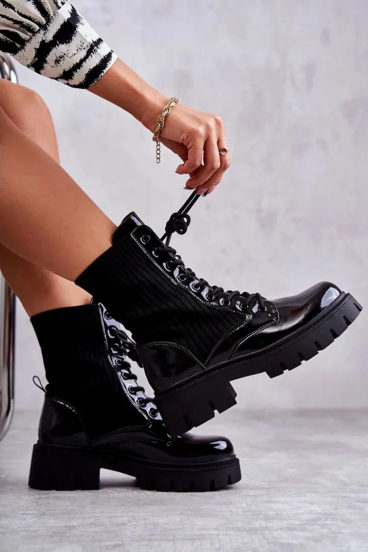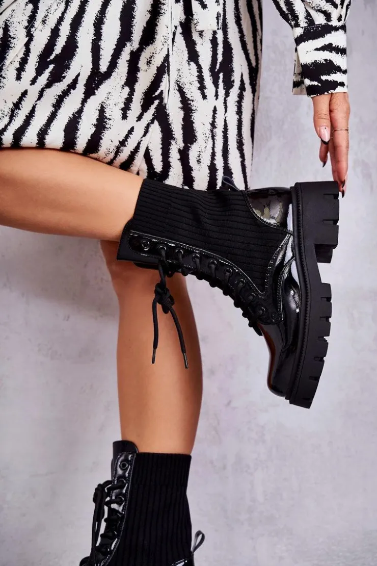 Modne botki damskie zostały wykonane z połączenia eko skóry oraz materiału tekstylnego w formie skarpety. Model klasycznie sznurowany. Botki zostały osadzone na platformie oraz płaskim obcasie. Ocieplone częściowo — na języku oraz wkładce. Model z usztywnianym zapiętkiem. Idealnie będą komponować się z krótkimi sukienkami, spódniczkami, a także spodniami. Przy wyborze rozmiaru prosimy sugerować się tabelą rozmiarów.