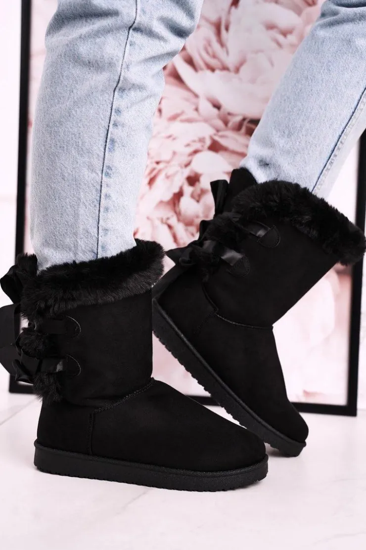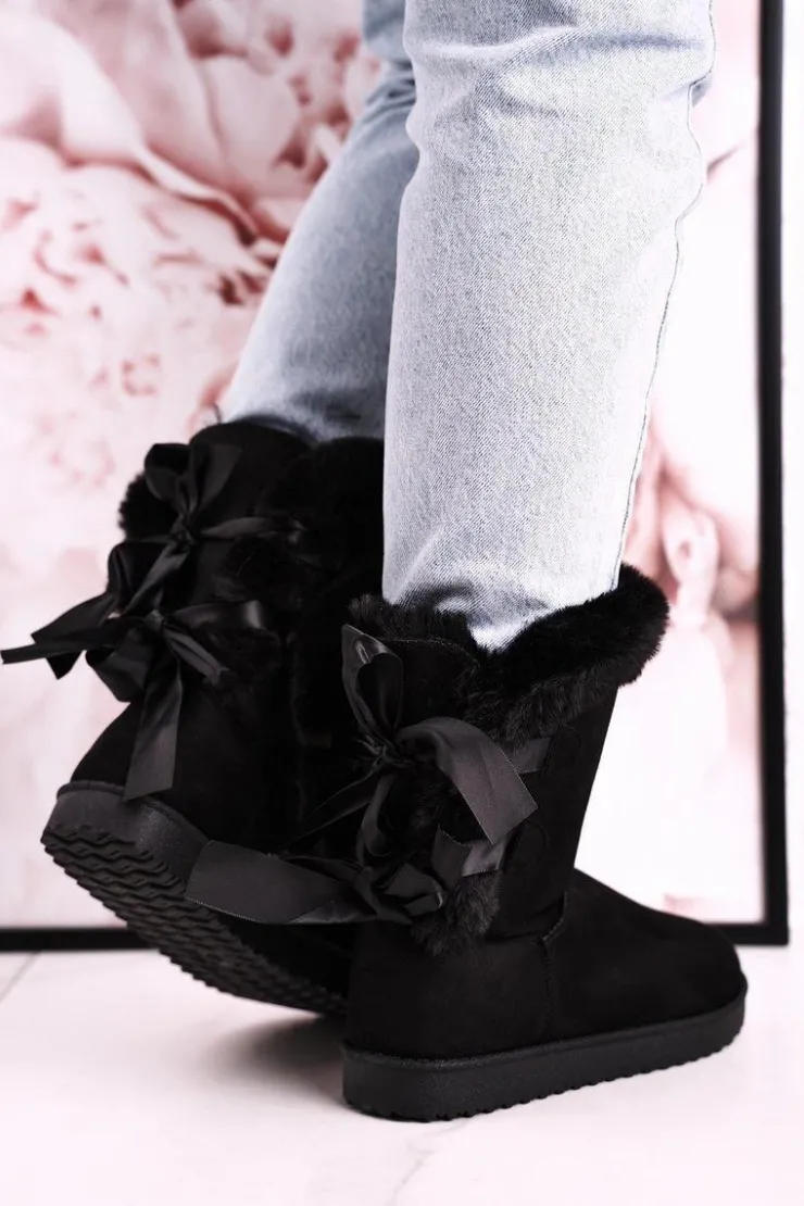 Boto Damskie Śniegowce Ze Wstążką Ocieplone Futerkiem Czarne Kaylee