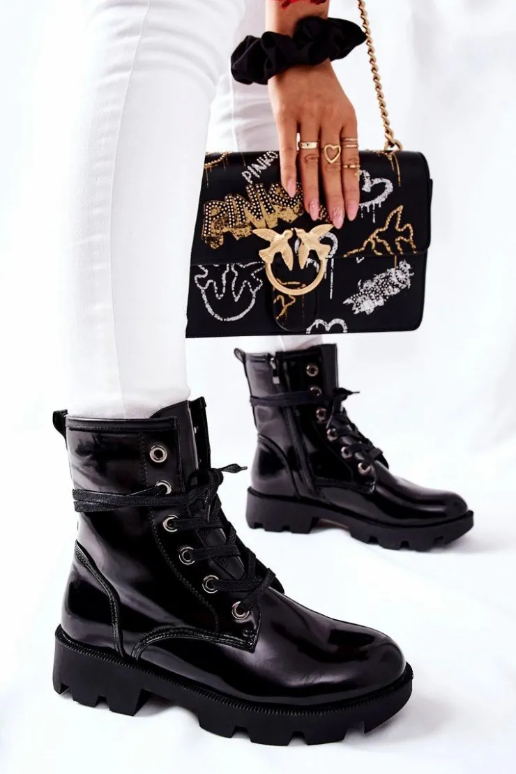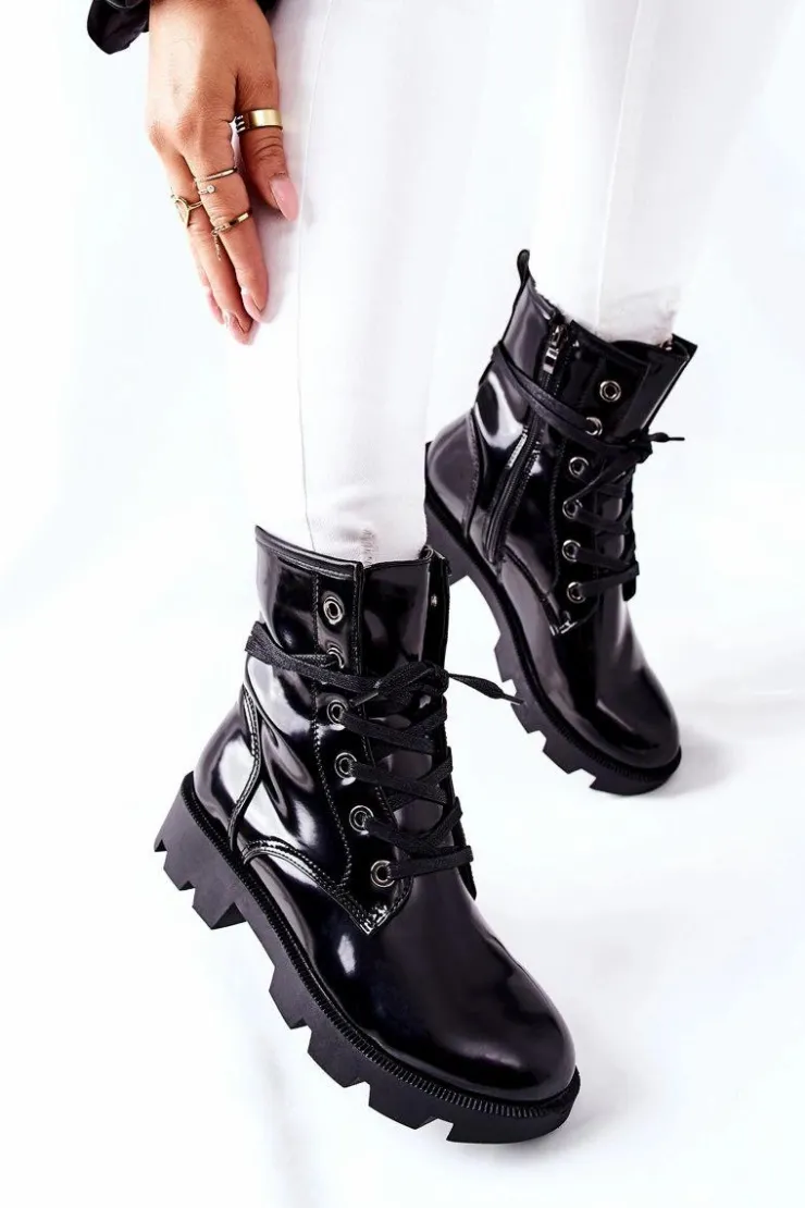 Klasyczny fason ze sznurowaniem oraz zapinaniem z boku cholewki. Wykonane z lakierowanej skóry ekologicznej. Przy wyborze rozmiaru prosimy sugerować się tabelą rozmiarów.
