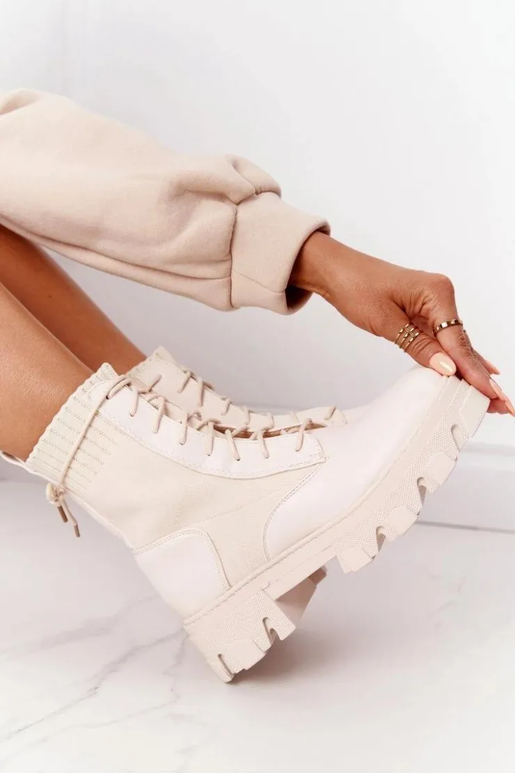Piękne botki damskie z materiałową cholewką. Wykonane zostały z eko skóry na grubej podeszwie. Przy wyborze rozmiaru prosimy sugerować się tabelą rozmiarów.