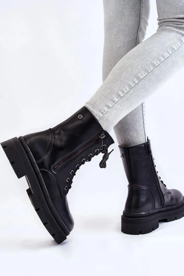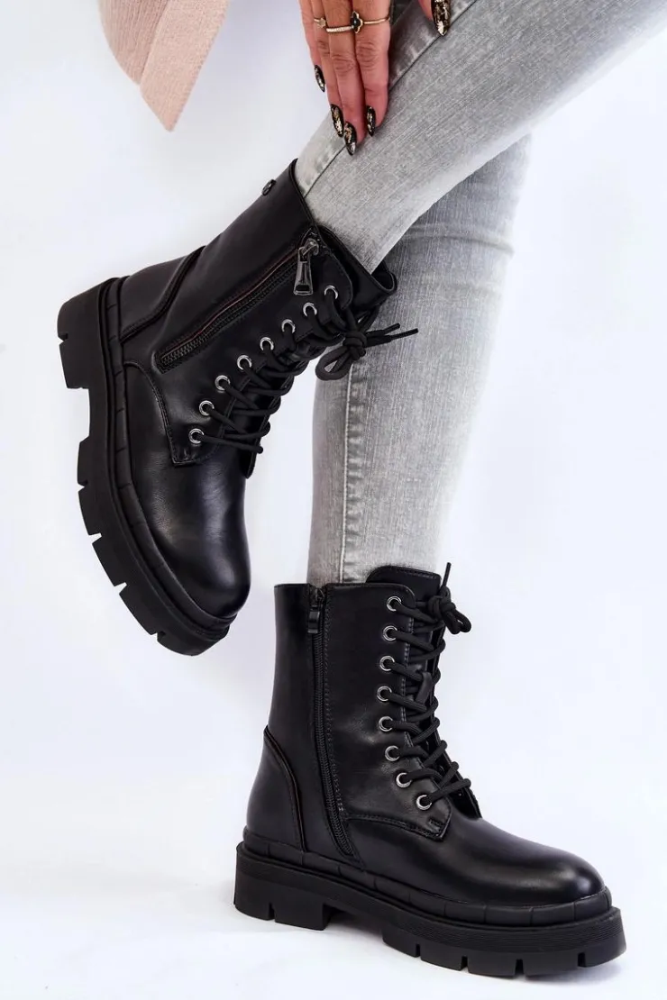 Klasyczne, damskie trapery zostały wykonane z eko skóry. Model posiada solidne sznurowanie oraz suwak. Dodatkowo po zewnętrznej stronie znajduje się ozdobny suwak. Botki osadzono na płaskim obcasie oraz podeszwie z bieżnikiem. Zapiętek jest usztywniany. Trapery nie posiadają ocieplenia. Ten klasyczny model powinien znaleźć się w Twojej szafie! Przy wyborze rozmiaru prosimy sugerować się tabelą rozmiarów.