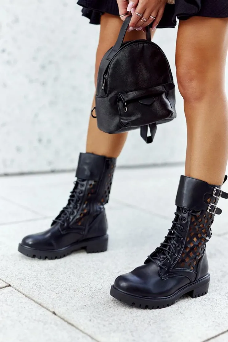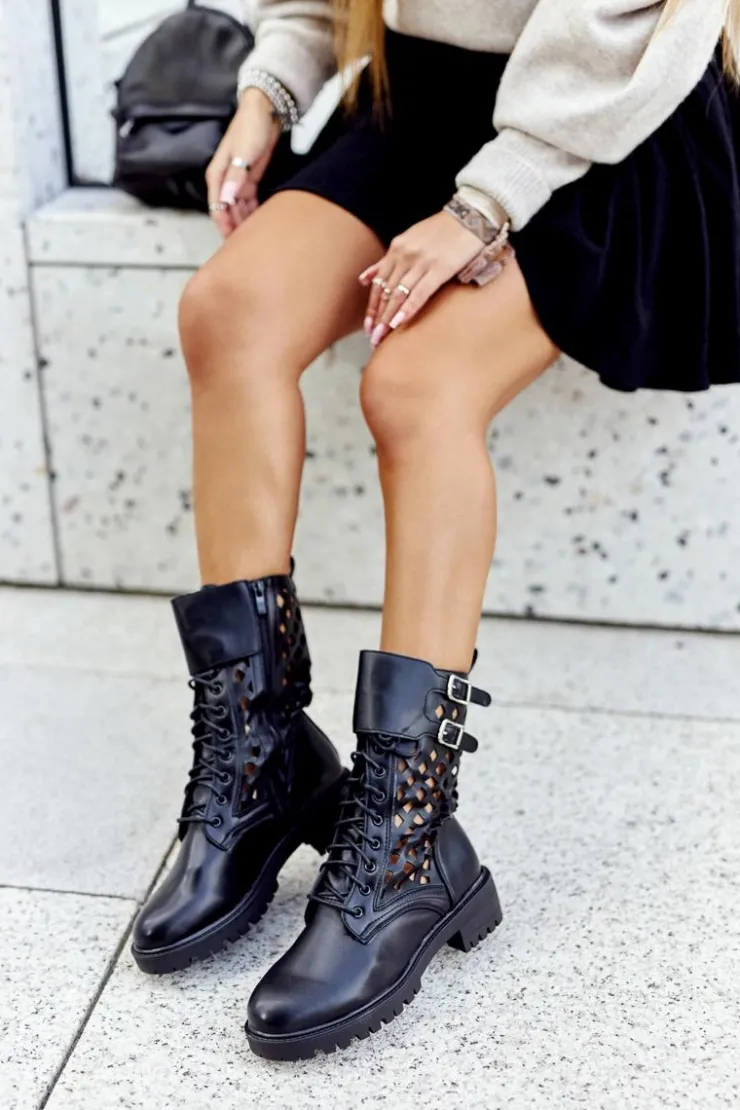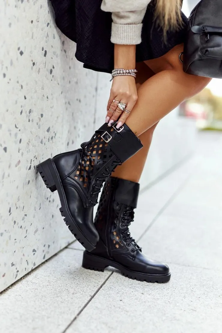 Botki, które wyrażą Twój charakter! Z nimi stworzysz wiele ciekawych stylizacji. Wysoka cholewka posiada ażurowe zdobienie oraz sprzączki. Klasyczny fason ze sznurowaniem oraz zapięciem na suwak. Botki w całości wykonane są z eko skóry. Nie czekaj! Musisz je mieć! Przy wyborze rozmiaru prosimy sugerować się tabelą rozmiarów.