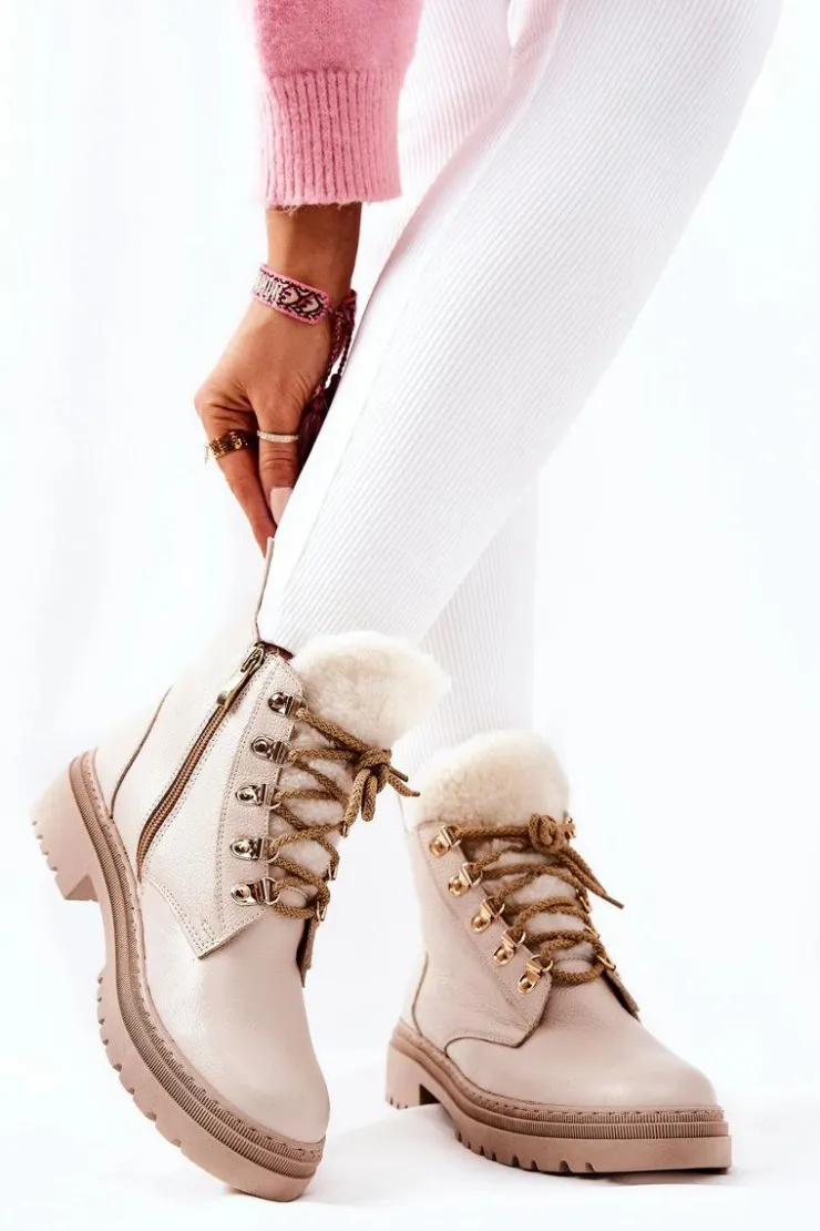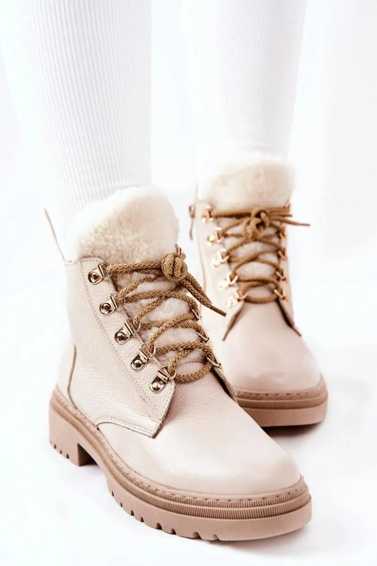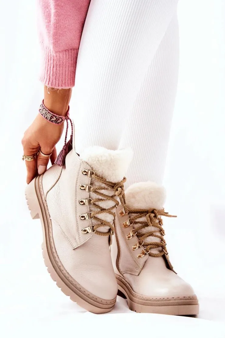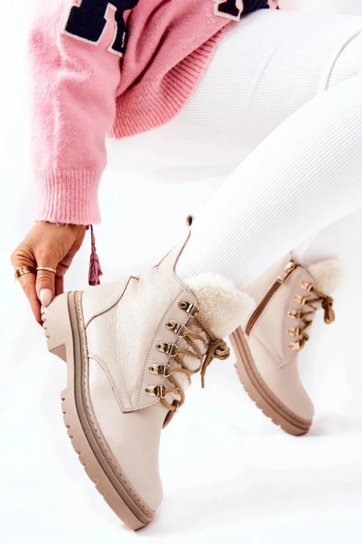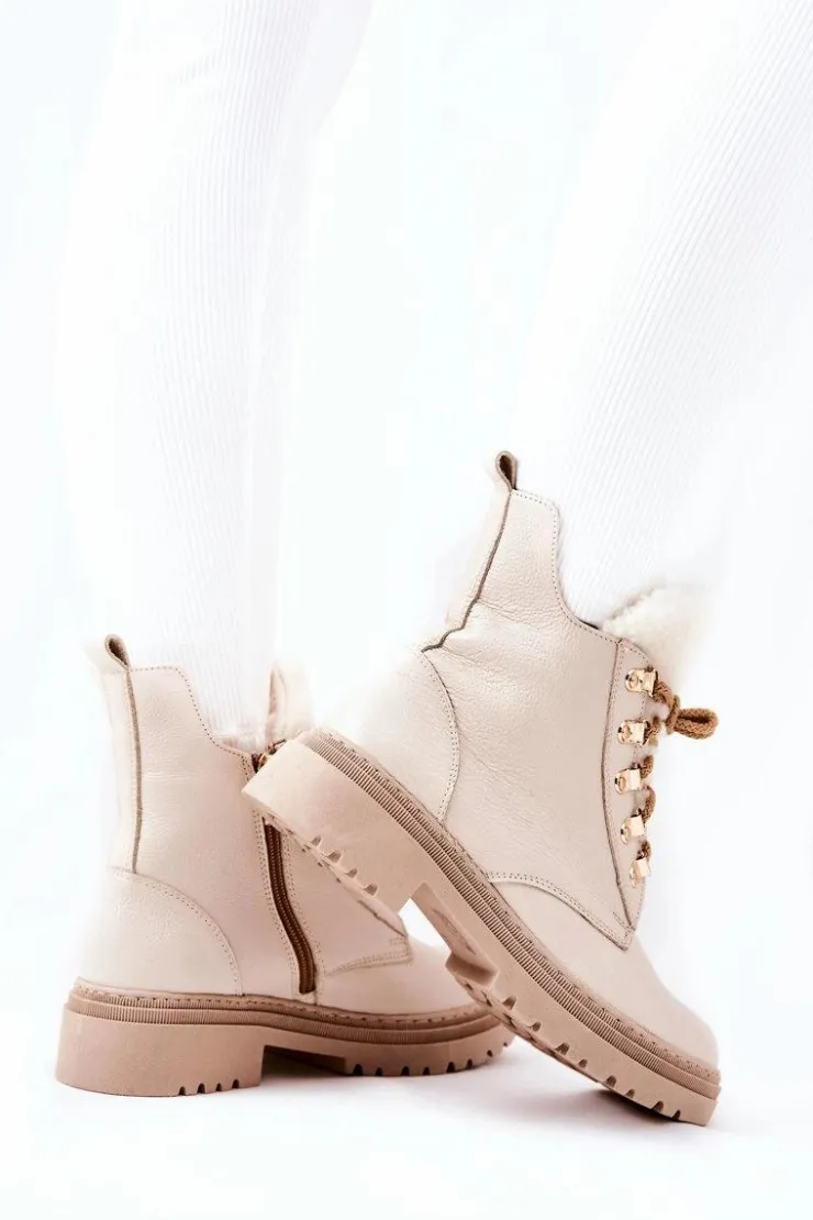 Boto Damskie Trapery|Botki Sznurowane*Skórzane Ocieplane Botki Beżowe Khaleni