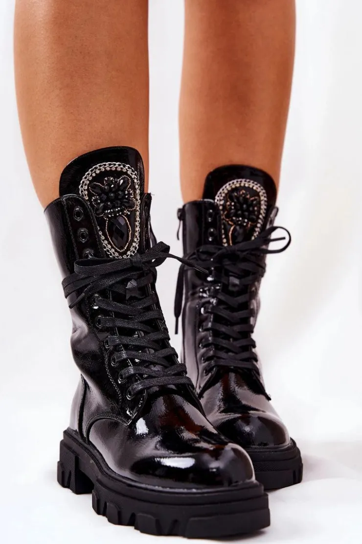 Świetne, wysokie botki posiadają na języku zdobienie w postaci koralików, cyrkonii oraz łańcuszka. Wykonane z lakierowanej eko skóry. Posiadają wiązanie oraz suwak ułatwiający zakładanie obuwia. Masywna, traperowa podeszwa zapewnia stabilność na każdym kroku. W środku posiadają ocieplenie w postaci delikatnego futerka. Przy wyborze rozmiaru prosimy sugerować się tabelą rozmiarów.