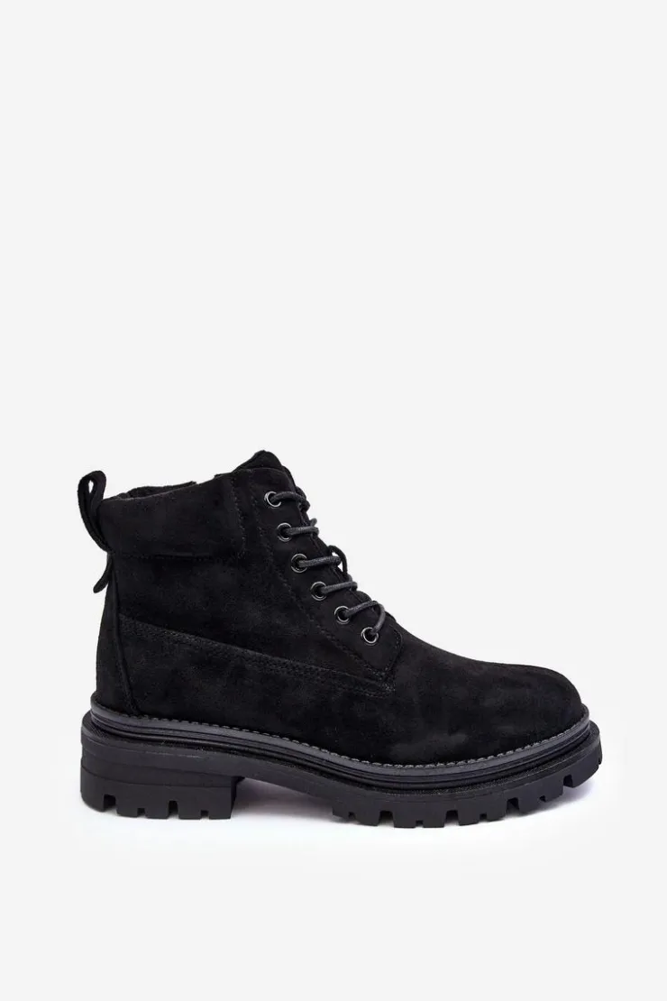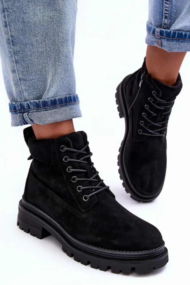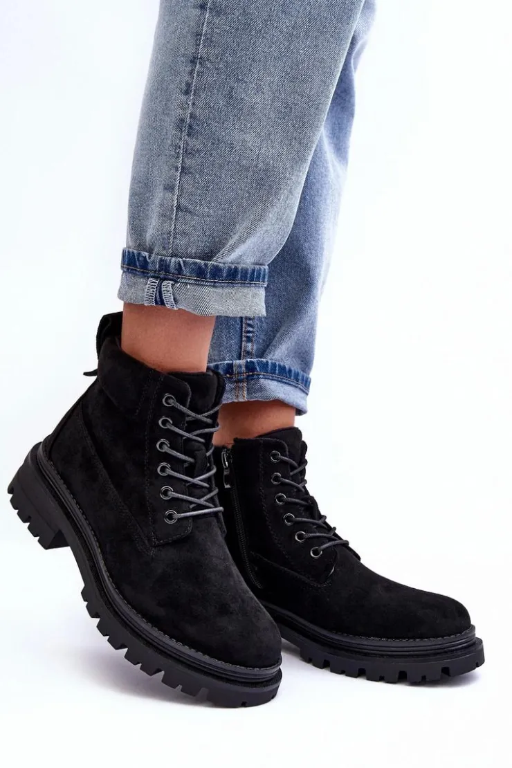 Trapery damskie wykonane z eko zamszu. Osadzone na płaskim, stabilnym obcasie i platformie. Wewnątrz znajduje się ciepłe i miłe w dotyku futerko. Zapinane na suwak oraz dodatkowo posiadają sznurowanie. Zapiętek usztywniony. Buty idealnie sprawdzą się w zimowe dni! Przy wyborze rozmiaru prosimy sugerować się tabelą rozmiarów.