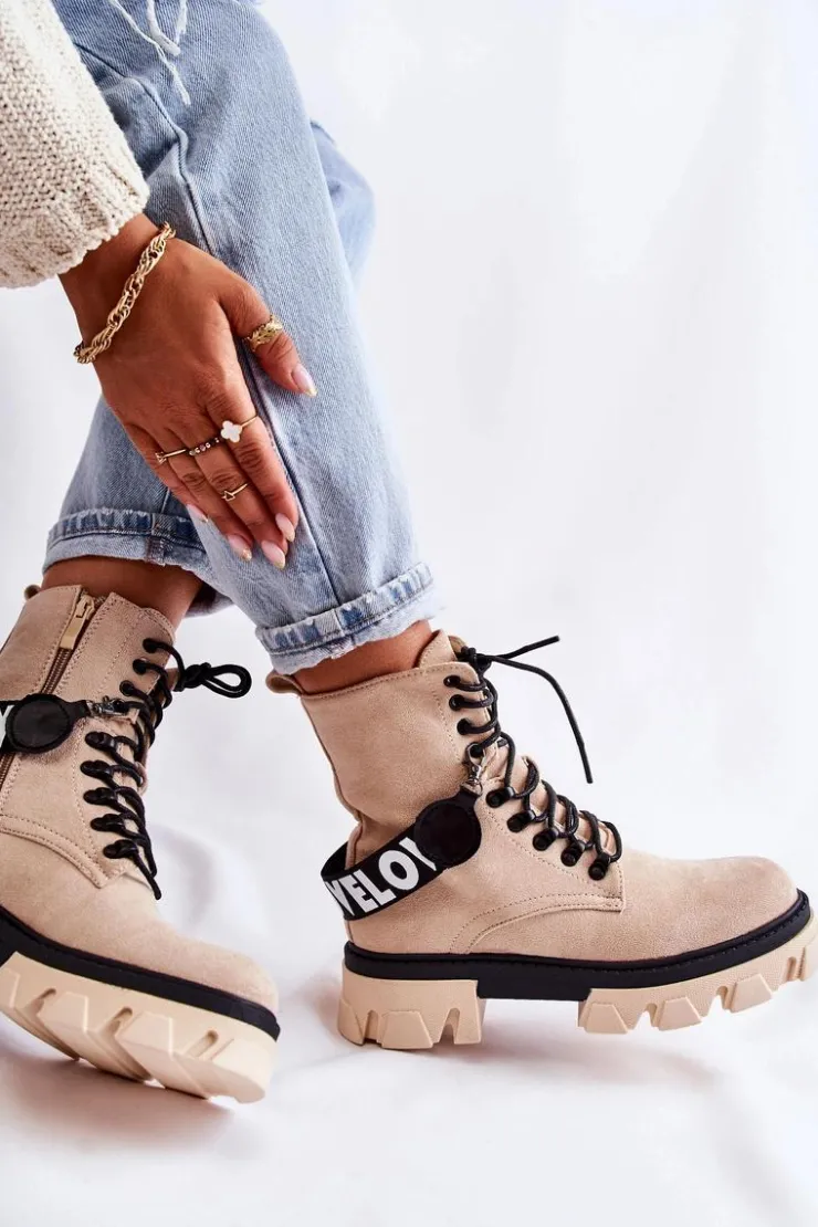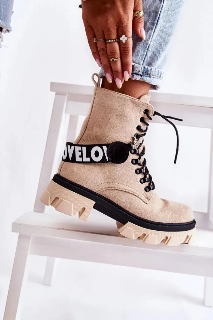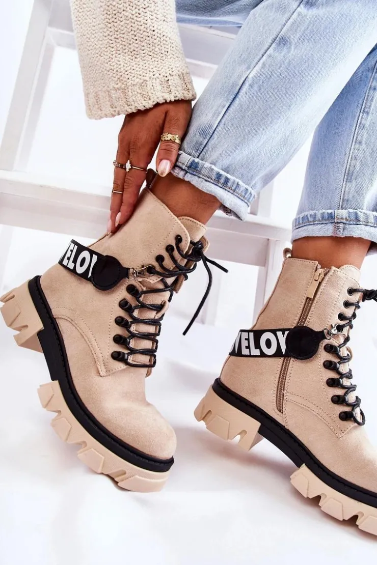 Ocieplane botki – workery świetnie sprawdzą podczas sezonu jesiennego. Zostały wykonane z eko zamszu. Posiadają delikatnie usztywniany zapiętek. Model z klasycznym wiązaniem oraz suwakiem z boku cholewki. Botki posiadają dodatkowo odpinany pasek z napisem. Osadzone na platformie z płaskim obcasem. Wysoka cholewka oraz wnętrze z kocem obuwniczym świetnie ochroni przed zimnem. Przy wyborze rozmiaru prosimy sugerować się tabelą rozmiarów.