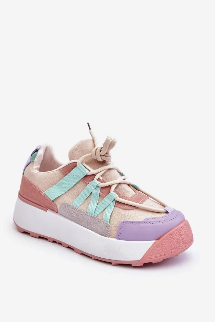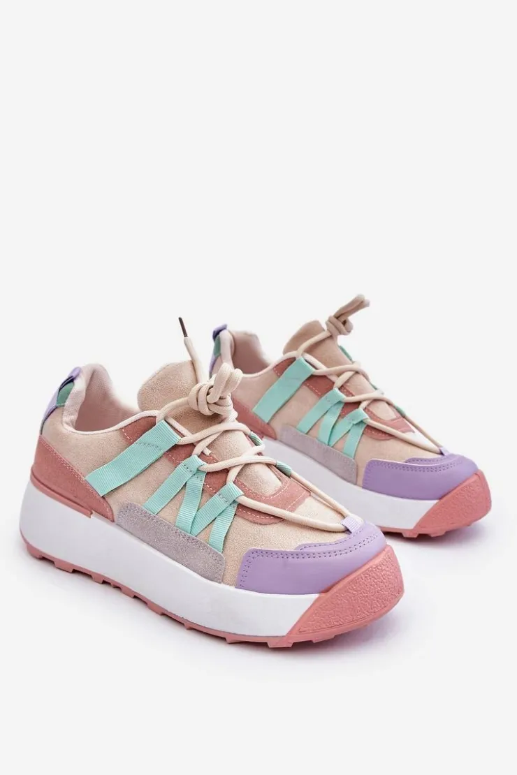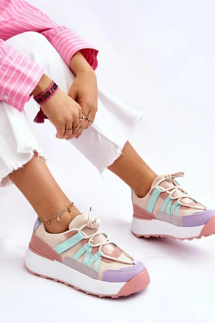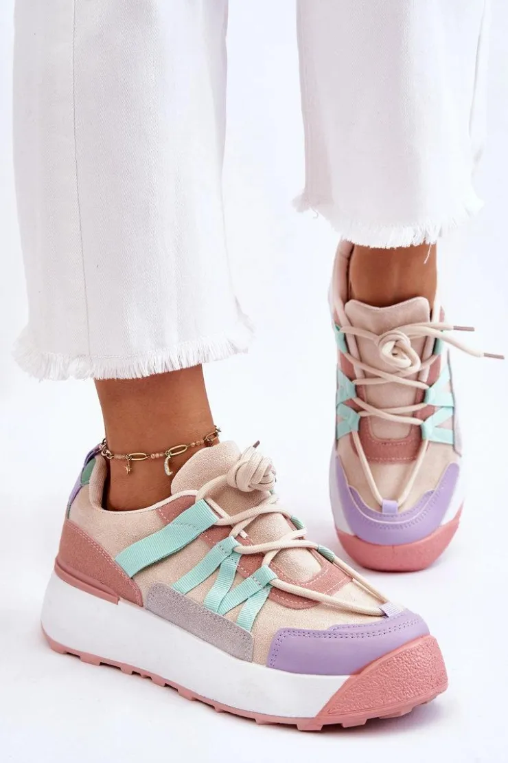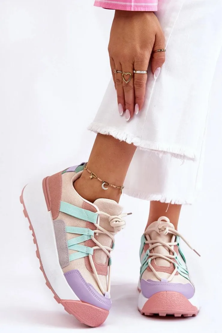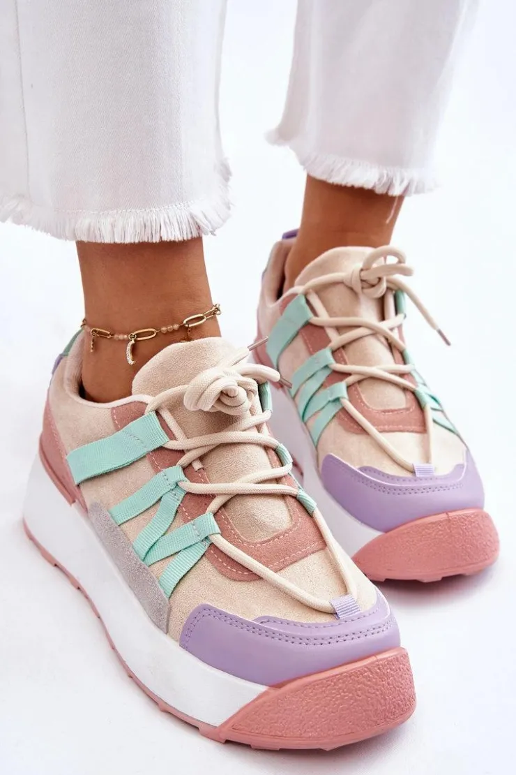 Damskie buty sportowe wykonane z eko zamszu. Zostały osadzone na masywnej platformie, która delikatnie uniesie Twoją sylwetkę. Model ten posiada klasyczne sznurowanie, które pozwoli na odpowiednie dopasowanie obuwia do tęgości nogi. Dodatkowo zapiętek jest usztywniany, a wkładka w tych butach jest wymienna. Przy wyborze rozmiaru prosimy kierować się tabelą rozmiarów.