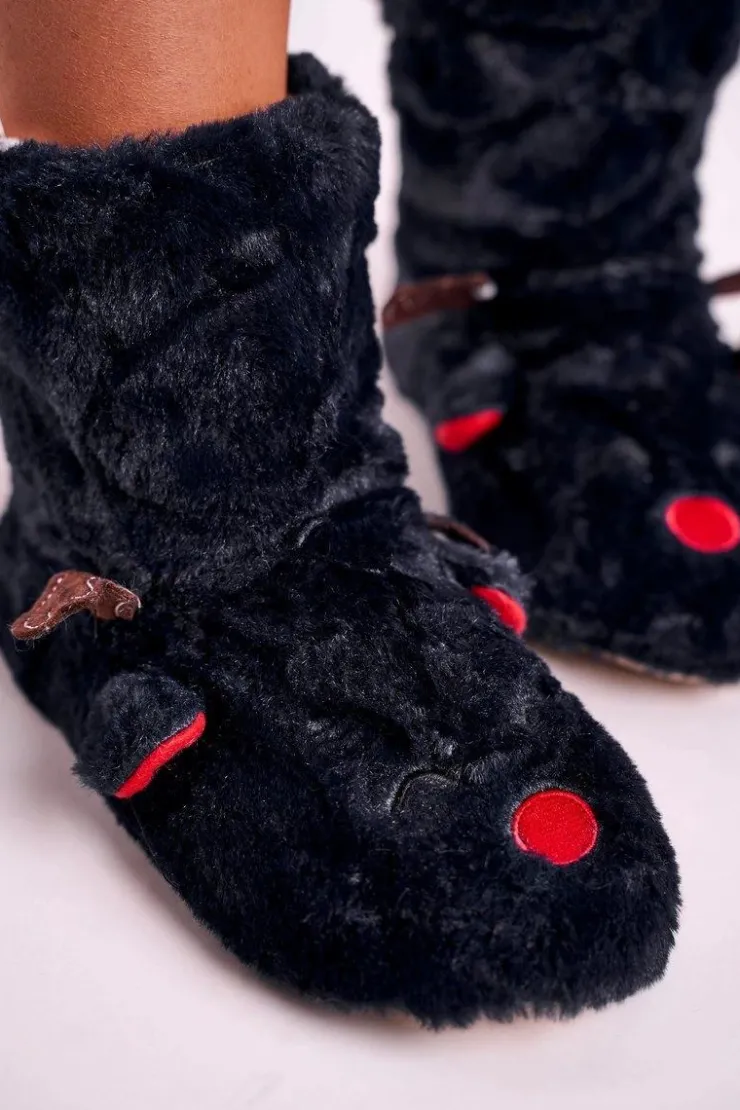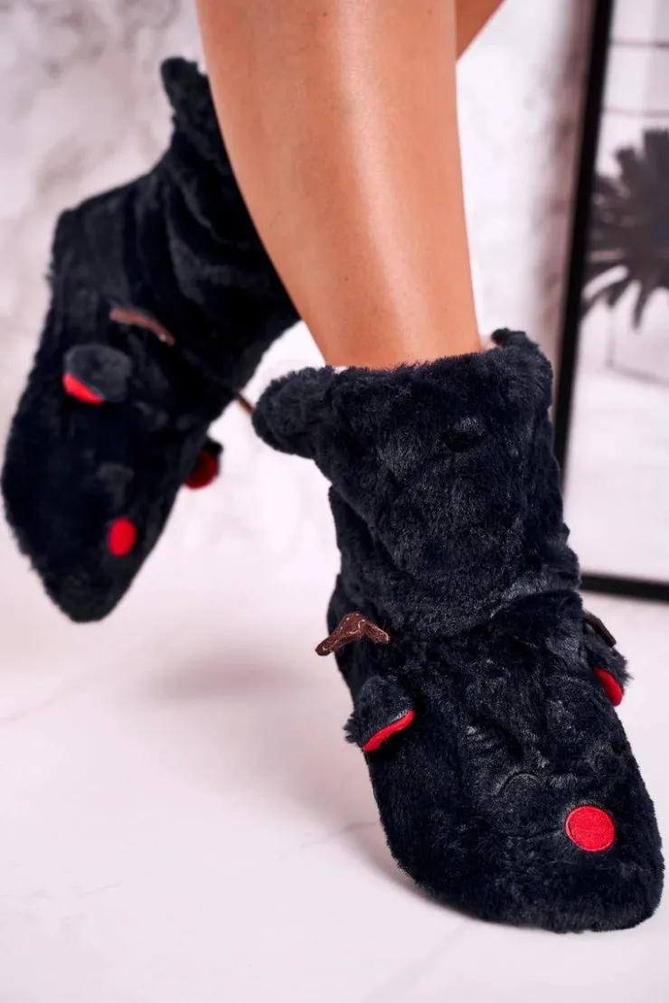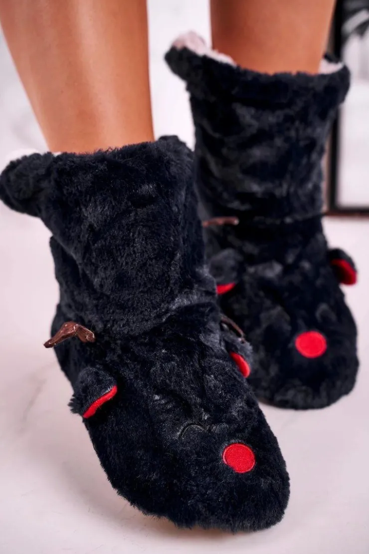 Boto Kapcie Klasyczne*Świąteczne Papcie Z Reniferem Ocieplone Kożuszkiem Czarne Rudolph
