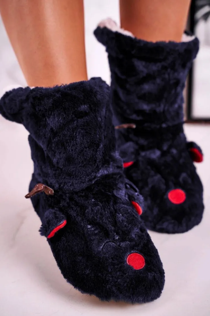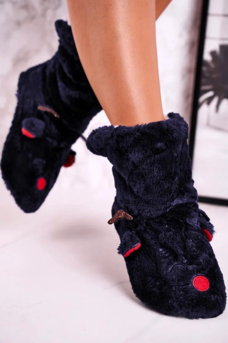 Boto Kapcie Klasyczne*Świąteczne Papcie Z Reniferem Ocieplone Kożuszkiem Granatowe Rudolph