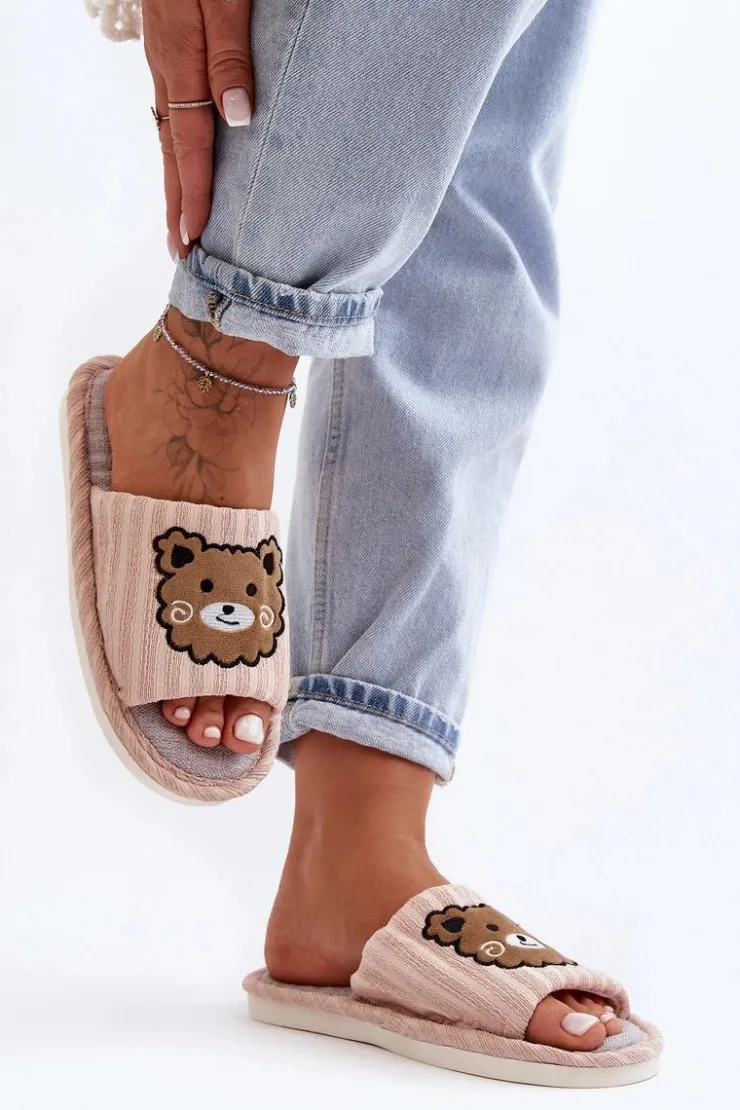 Kapcie damskie wykonane z materiału tekstylnego. Osadzone na płaskiej, gumowej podeszwie. Z przodu znajdują się naszywki misie. Noski otwarte. Idealne na relaks w domowym zaciszu! Przy wyborze rozmiaru prosimy kierować się tabelą rozmiarów.