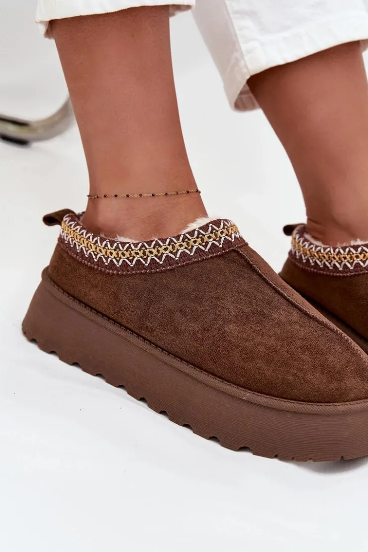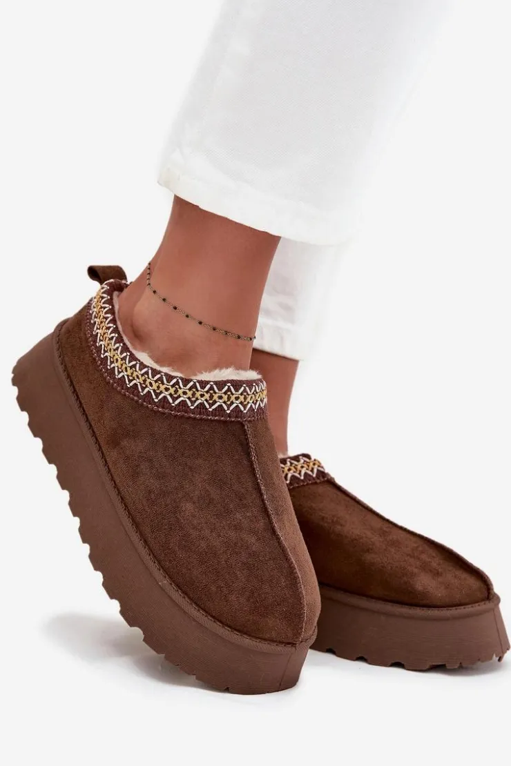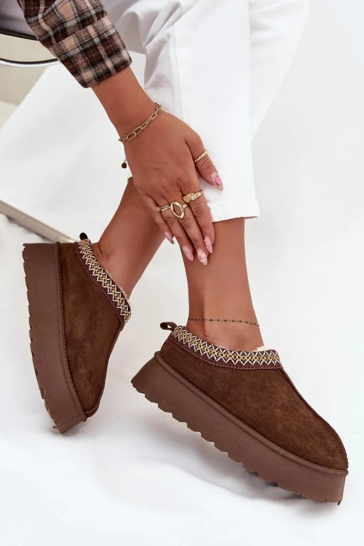 Stylowe kapcie wykonane z eko zamszu to doskonały wybór na chłodniejsze dni. Osadzone na platformie, z zakrytymi noskami i ocieplane miękkim futerkiem, zapewniają komfort i ciepło. Górę cholewki zdobi subtelny haft, który nadaje im eleganckiego charakteru. Idealne do codziennego użytku w domu oraz szybkie wyjścia na zewnątrz. Przy wyborze rozmiaru prosimy kierować tabelą rozmiarów.