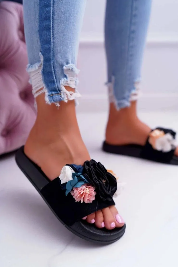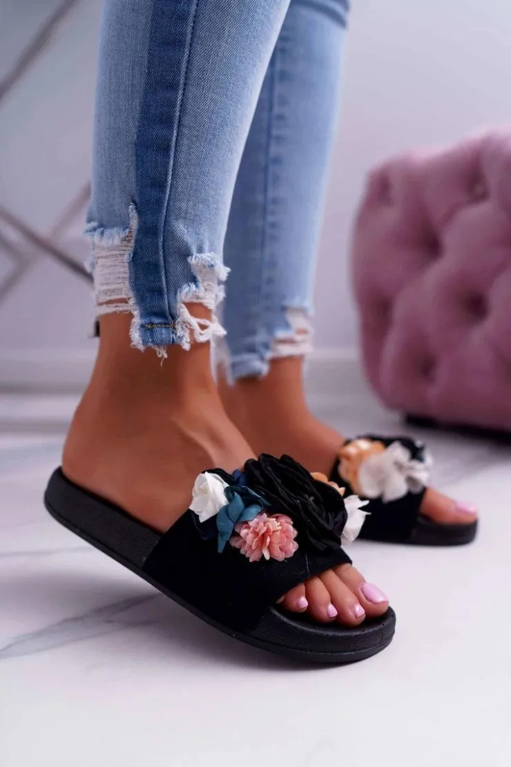 Boto Klapki Damskie Klasyczne*Damskie Klapki Z Kwiatem Czarne Della